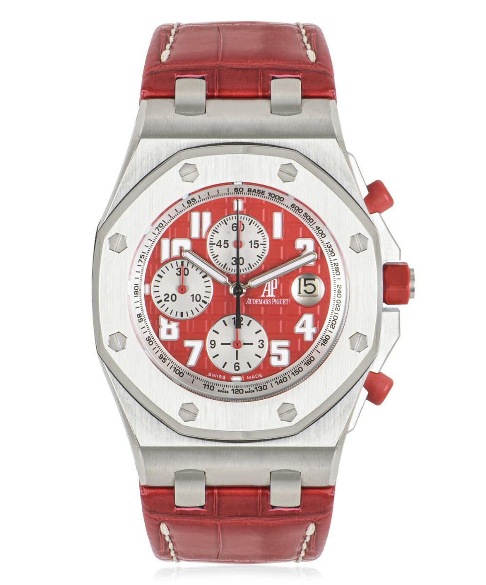 This Audemars Piguet Royal Oak Offshore 26108ST.OO.D066CR.01 has a red arabic dial and a leather strap. This Audemars Piguet has undergone a thorough inspection of accuracy, functionality and condition at our Audemars Piguet certified service centre to determine the level of reconditioning required to meet our strict standards. It has also been checked against our records to ensure authenticity. All our watches have a 24-month warranty for your peace of mind.