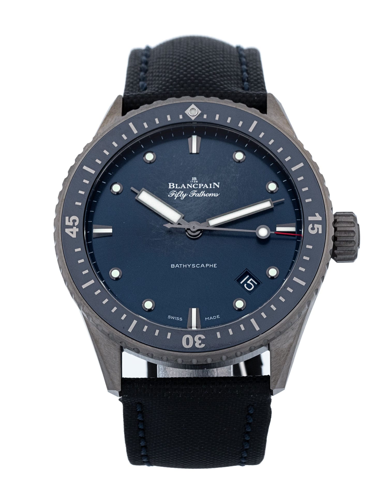 This Blancpain Fifty Fathoms 5000-0240-O52A has a blue dial and a fabric strap. This Blancpain has undergone a thorough inspection of water resistance, accuracy, functionality and condition to determine the level of reconditioning required to meet our strict standards. It has also been referenced against technical documents and manufacturer records where available to ensure authenticity and a clean history. All our watches have a 24-month warranty for your peace of mind.