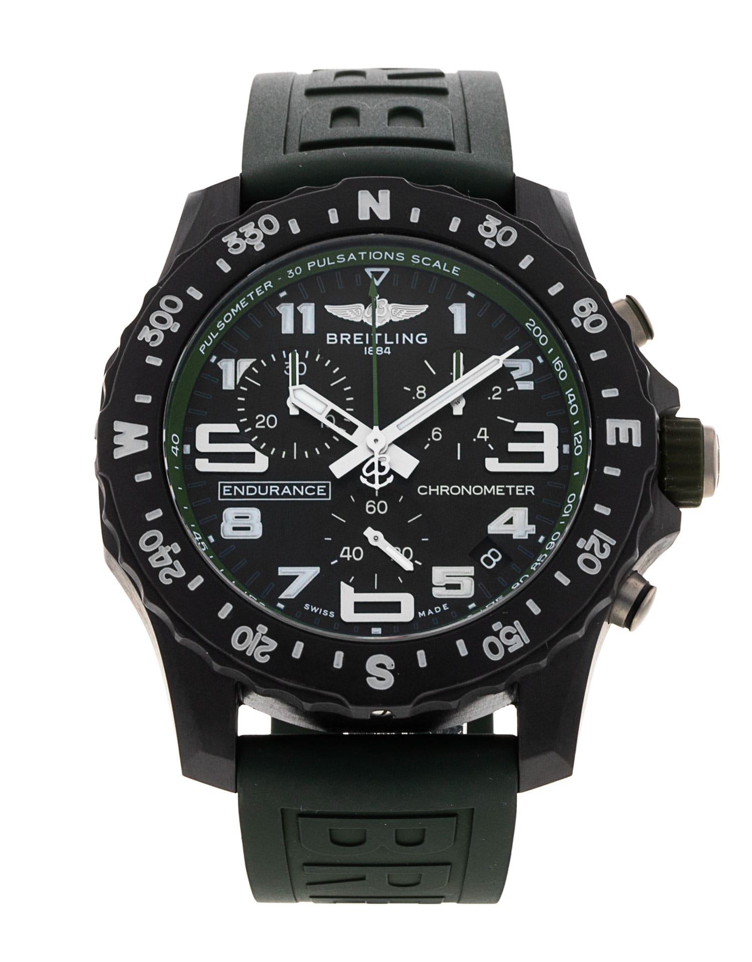 This Breitling Endurance Pro X82310 has a black arabic dial and a rubber strap. This Breitling has undergone a thorough inspection of water resistance, accuracy, functionality and condition to determine the level of reconditioning required to meet our strict standards. It has also been referenced against technical documents and manufacturer records where available to ensure authenticity and a clean history. All our watches have a 24-month warranty for your peace of mind.