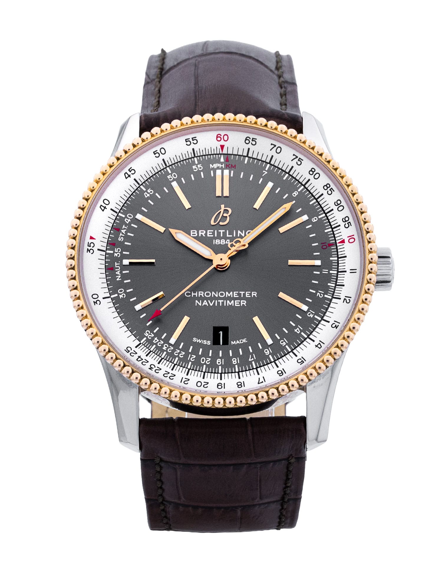 This Breitling Navitimer Automatic 41 U17326 has a anthracite dial and a leather strap. This Breitling has undergone a thorough inspection of water resistance, accuracy, functionality and condition to determine the level of reconditioning required to meet our strict standards. It has also been referenced against technical documents and manufacturer records where available to ensure authenticity and a clean history. All our watches have a 24-month warranty for your peace of mind.