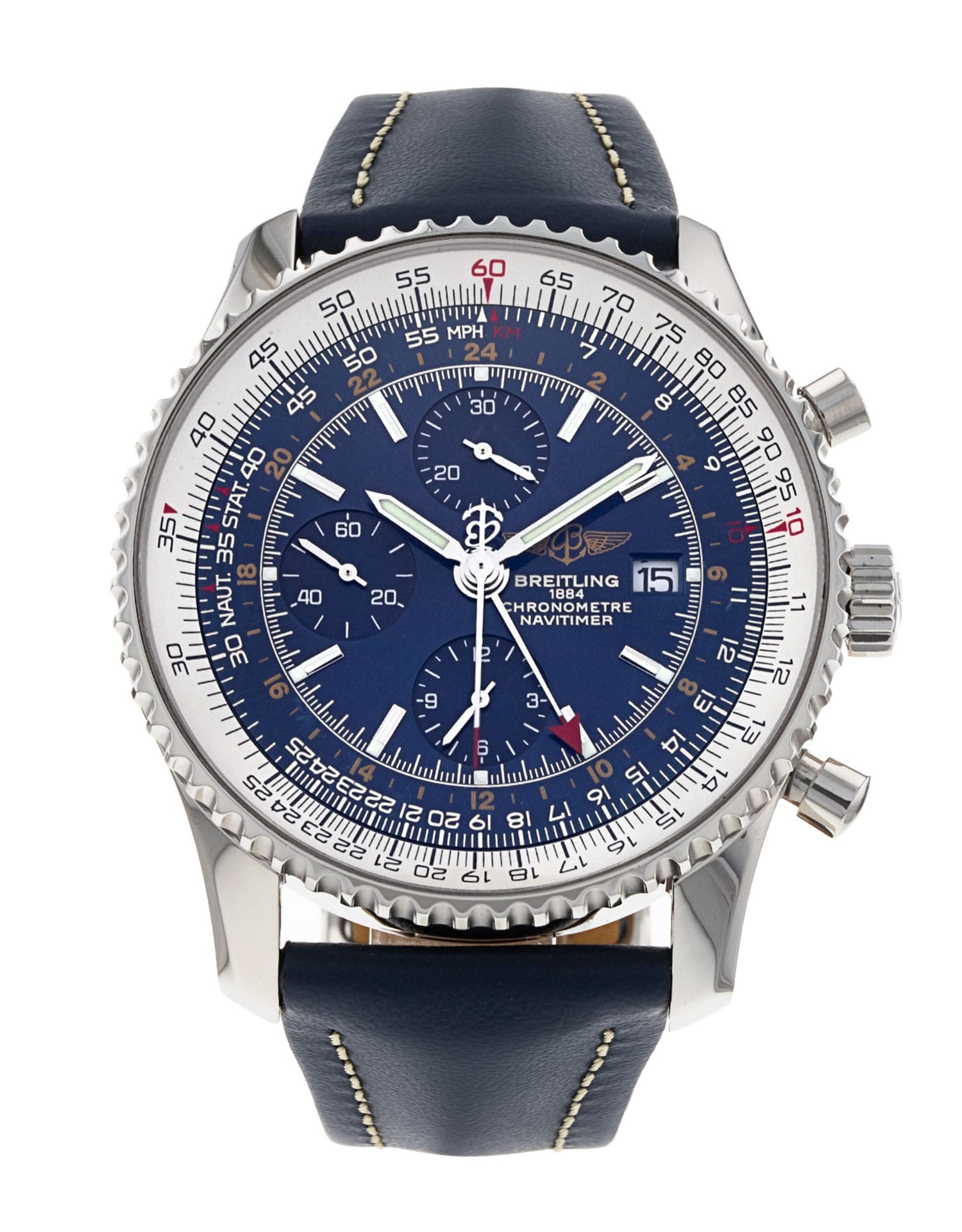 This Breitling Navitimer Chronograph GMT 46 A24322 has a blue baton dial and a leather strap. This Breitling has undergone a thorough inspection of water resistance, accuracy, functionality and condition to determine the level of reconditioning required to meet our strict standards. It has also been referenced against technical documents and manufacturer records where available to ensure authenticity and a clean history. All our watches have a 24-month warranty for your peace of mind.