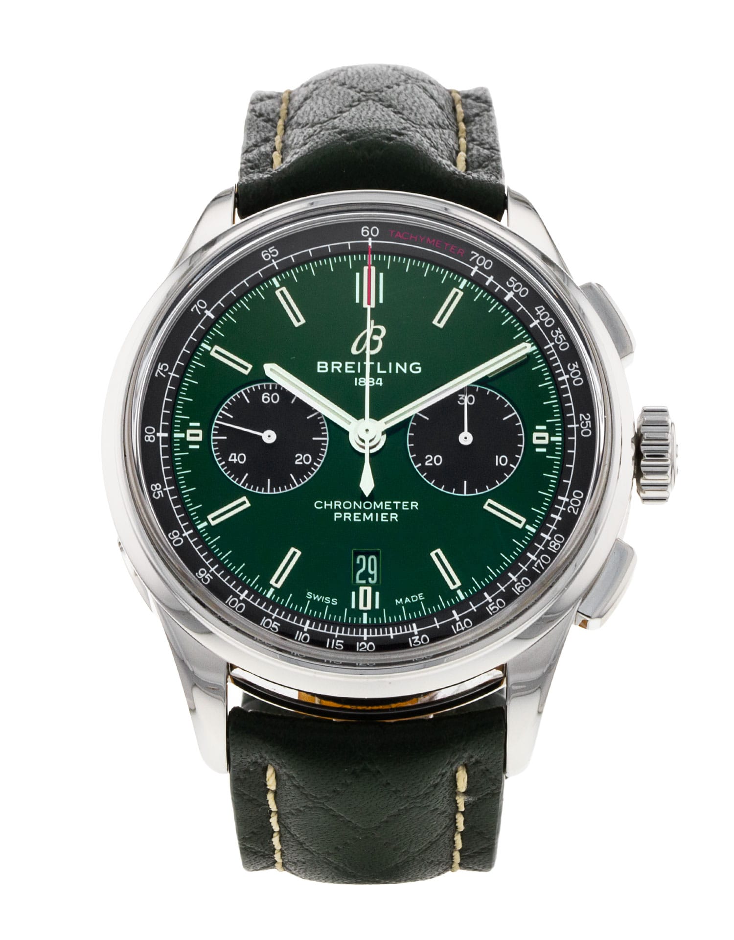 This Breitling Premier B01 AB0118 has a green baton dial and a leather strap. This Breitling has undergone a thorough inspection of water resistance, accuracy, functionality and condition to determine the level of reconditioning required to meet our strict standards. It has also been referenced against technical documents and manufacturer records where available to ensure authenticity and a clean history. Our watches have a 24-month warranty for your peace of mind, in conjunction with any remaining manufacturer’s warranty from new or from service.