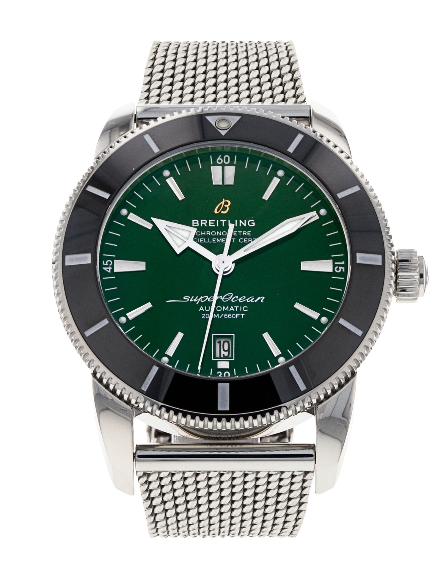 This Breitling SuperOcean Heritage B20 Automatic 46 AB2020 has a green baton dial and a bracelet strap. This Breitling has undergone a thorough inspection of water resistance, accuracy, functionality and condition to determine the level of reconditioning required to meet our strict standards. It has also been referenced against technical documents and manufacturer records where available to ensure authenticity and a clean history. Our watches have a 24-month warranty for your peace of mind, in conjunction with any remaining manufacturer’s warranty from new or from service.