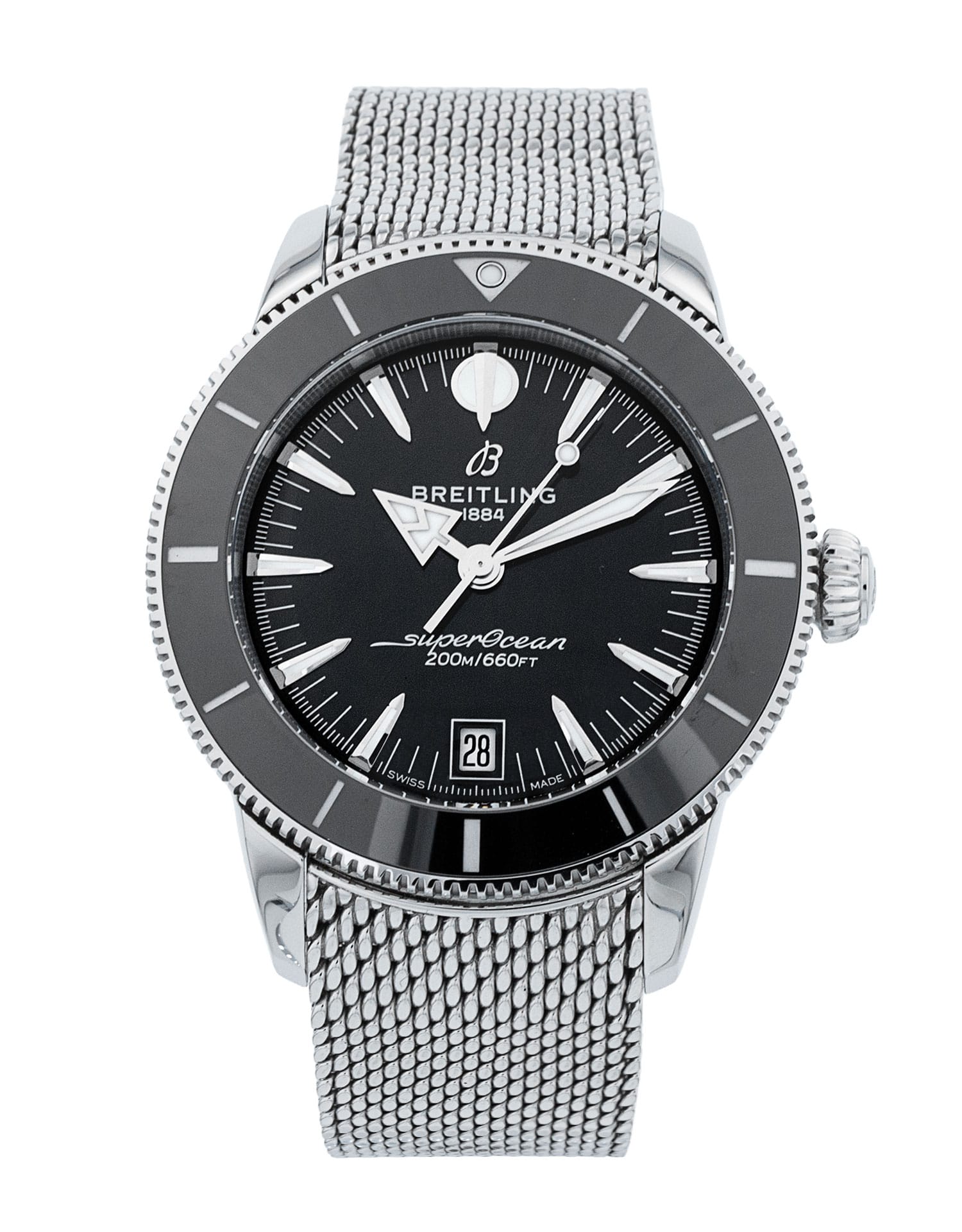 This Breitling SuperOcean Heritage AB3110 has a black dial and a bracelet strap. This Breitling has undergone a thorough inspection of water resistance, accuracy, functionality and condition to determine the level of reconditioning required to meet our strict standards. It has also been referenced against technical documents and manufacturer records where available to ensure authenticity and a clean history. Our watches have a 24-month warranty for your peace of mind, in conjunction with any remaining manufacturer’s warranty from new or from service.