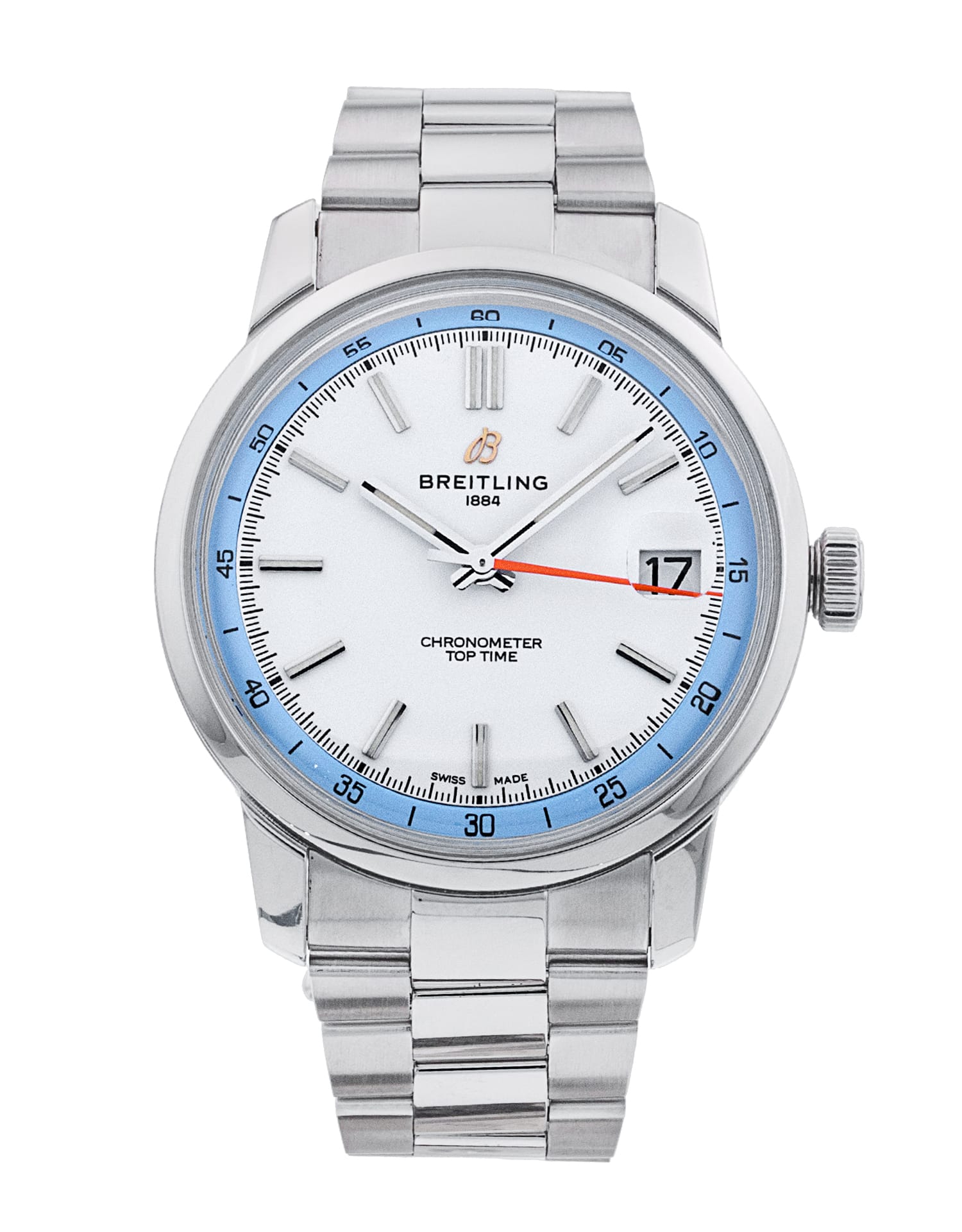 This Breitling Top Time AB3113 has a white baton dial and a bracelet strap. This Breitling has undergone a thorough inspection of water resistance, accuracy, functionality and condition to determine the level of reconditioning required to meet our strict standards. It has also been referenced against technical documents and manufacturer records where available to ensure authenticity and a clean history. All our watches have a 24-month warranty for your peace of mind.