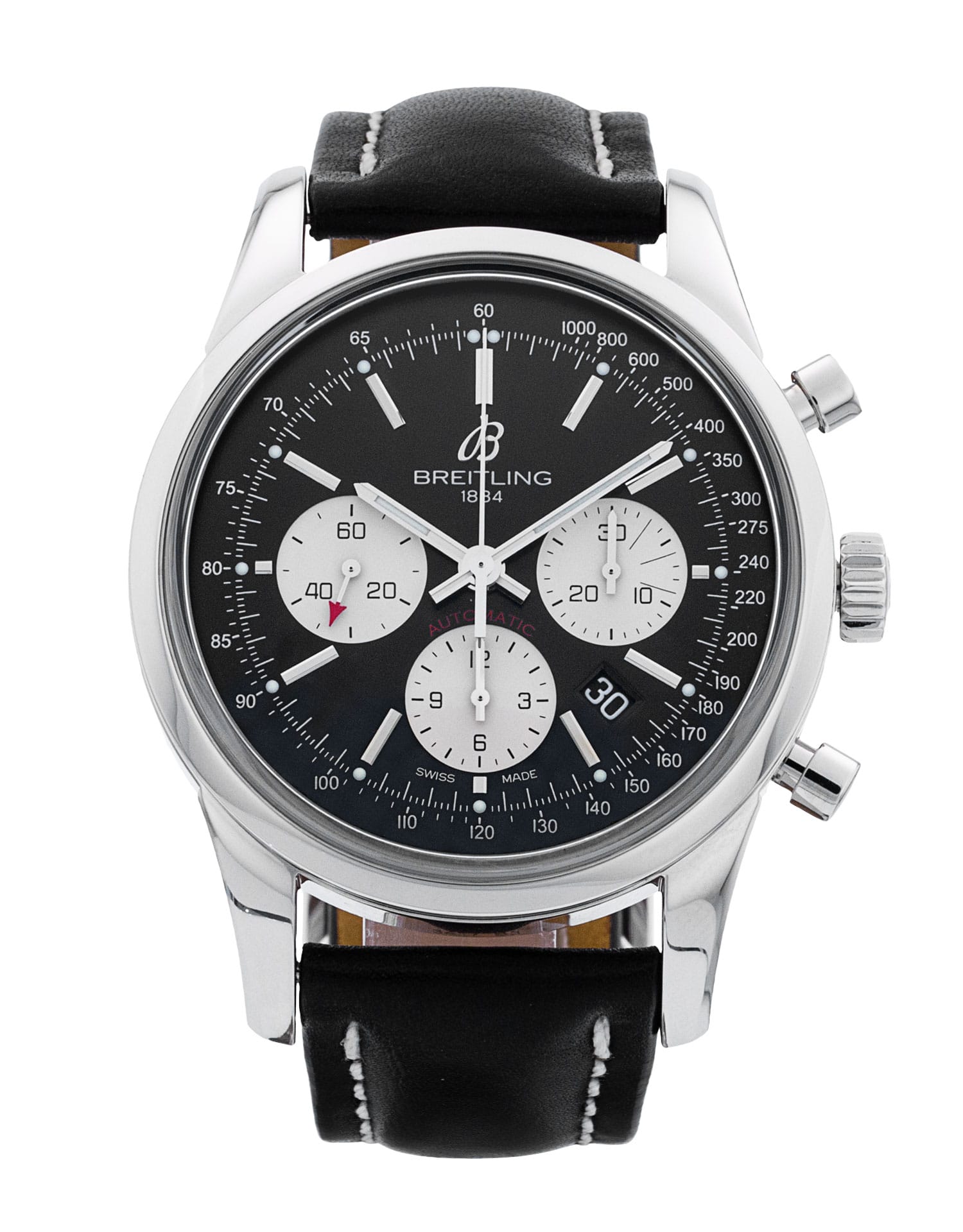 This Breitling Transocean Chronograph AB0152 has a black baton dial and a leather strap. This Breitling has undergone a thorough inspection of accuracy, functionality and condition to determine the level of reconditioning required to meet our strict standards. It has also been referenced against technical documents and manufacturer records where available to ensure authenticity and a clean history. All our watches have a 24-month warranty for your peace of mind.