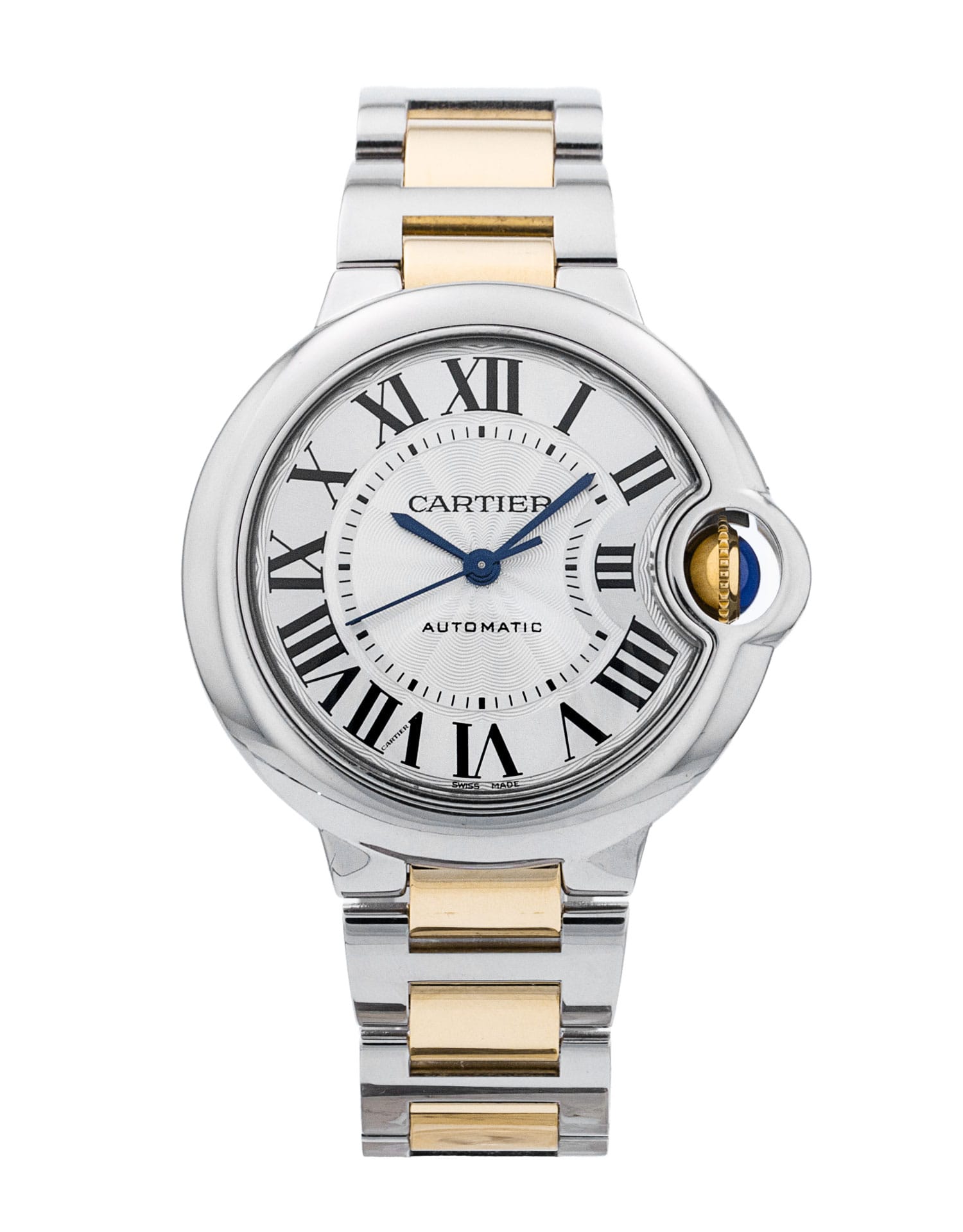 This Cartier Ballon Bleu De Cartier W2BB0029 has a silver roman numeral dial and a bracelet strap. This Cartier has undergone a thorough inspection of accuracy, functionality and condition at our Cartier certified service centre to determine the level of reconditioning required to meet our strict standards. It has also been checked against our records to ensure authenticity. All our watches have a 24-month warranty for your peace of mind.
