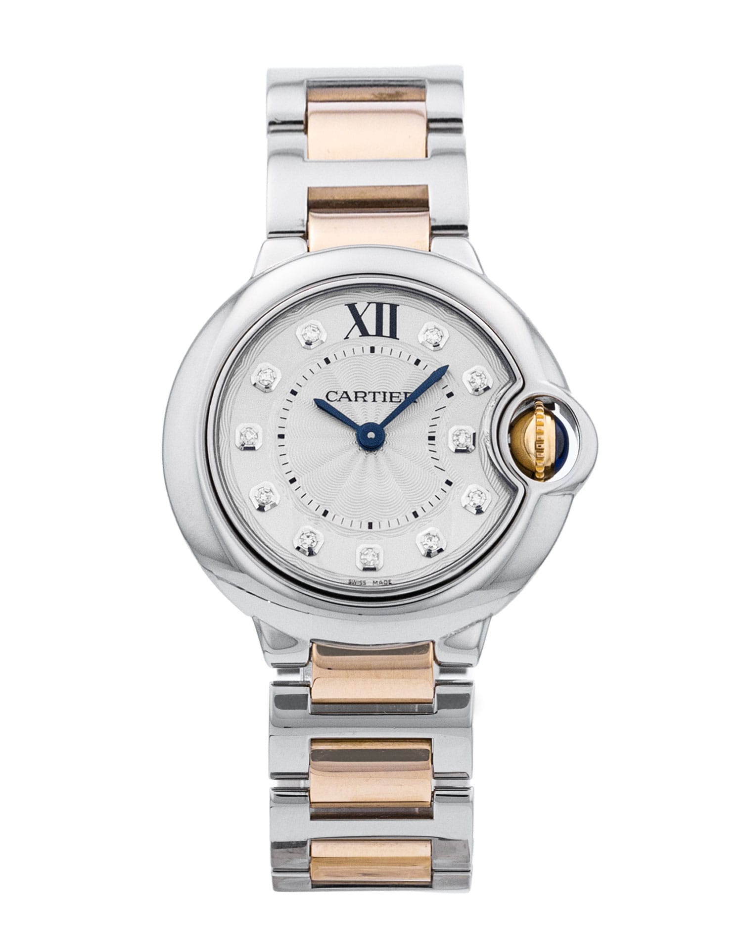 This Cartier Ballon Bleu WE902030 has a silver diamond dial and a bracelet strap. This Cartier has undergone a thorough inspection of accuracy, functionality and condition at our Cartier certified service centre to determine the level of reconditioning required to meet our strict standards. It has also been checked against our records to ensure authenticity. All our watches have a 24-month warranty for your peace of mind.