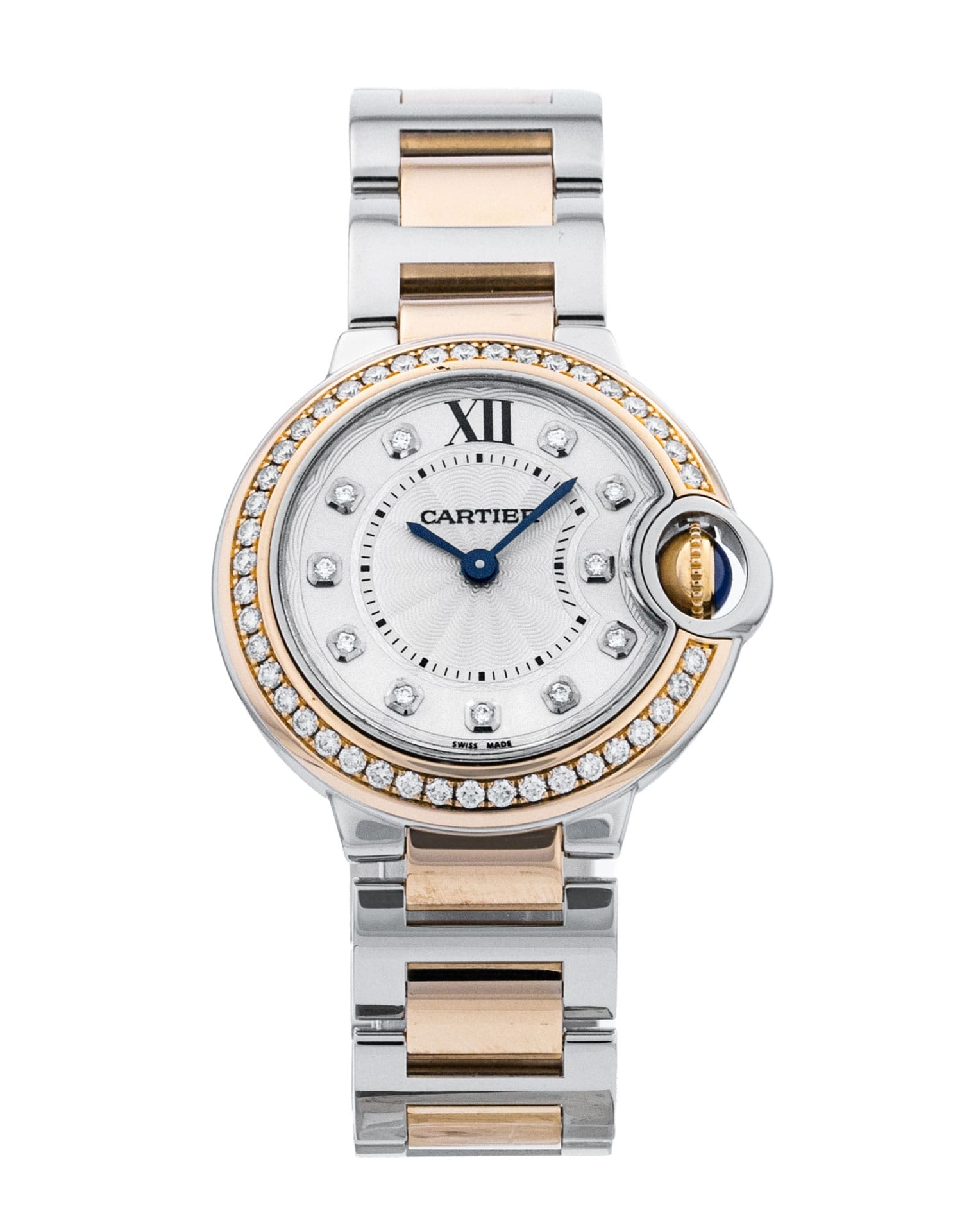 This Cartier Ballon Bleu WE902076 has a silver diamond dial and a bracelet strap. This Cartier has undergone a thorough inspection of accuracy, functionality and condition at our Cartier certified service centre to determine the level of reconditioning required to meet our strict standards. It has also been checked against our records to ensure authenticity. All our watches have a 24-month warranty for your peace of mind.