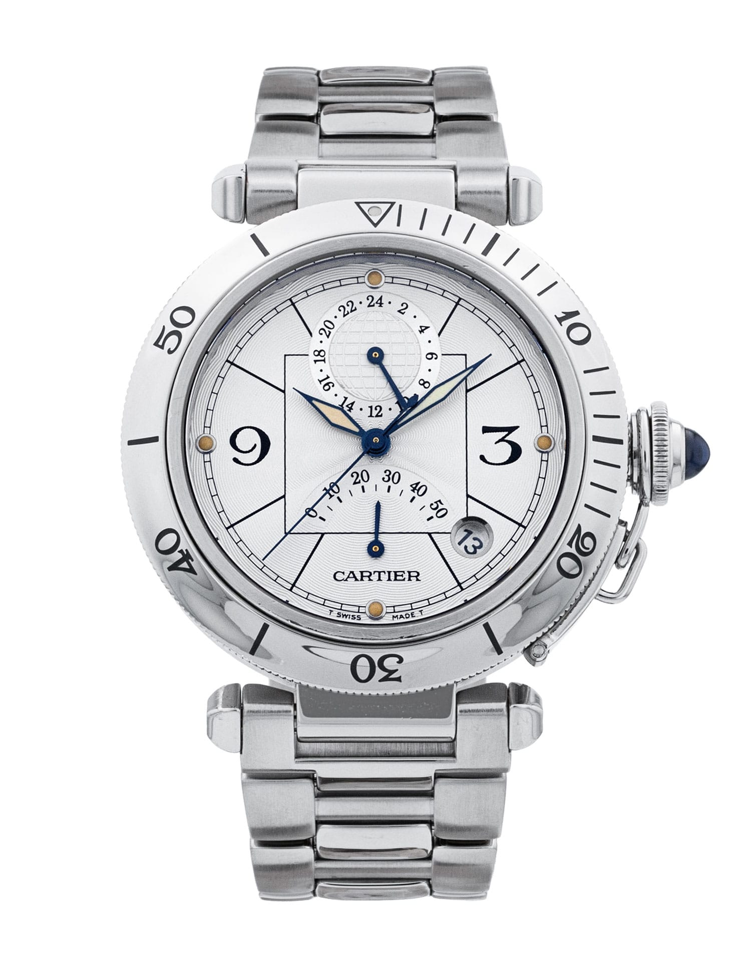 This Cartier Pasha W31037H3 has a silver dial and a bracelet strap. This Cartier has undergone a thorough inspection of accuracy, functionality and condition at our Cartier certified service centre to determine the level of reconditioning required to meet our strict standards. It has also been checked against our records to ensure authenticity. All our watches have a 24-month warranty for your peace of mind.