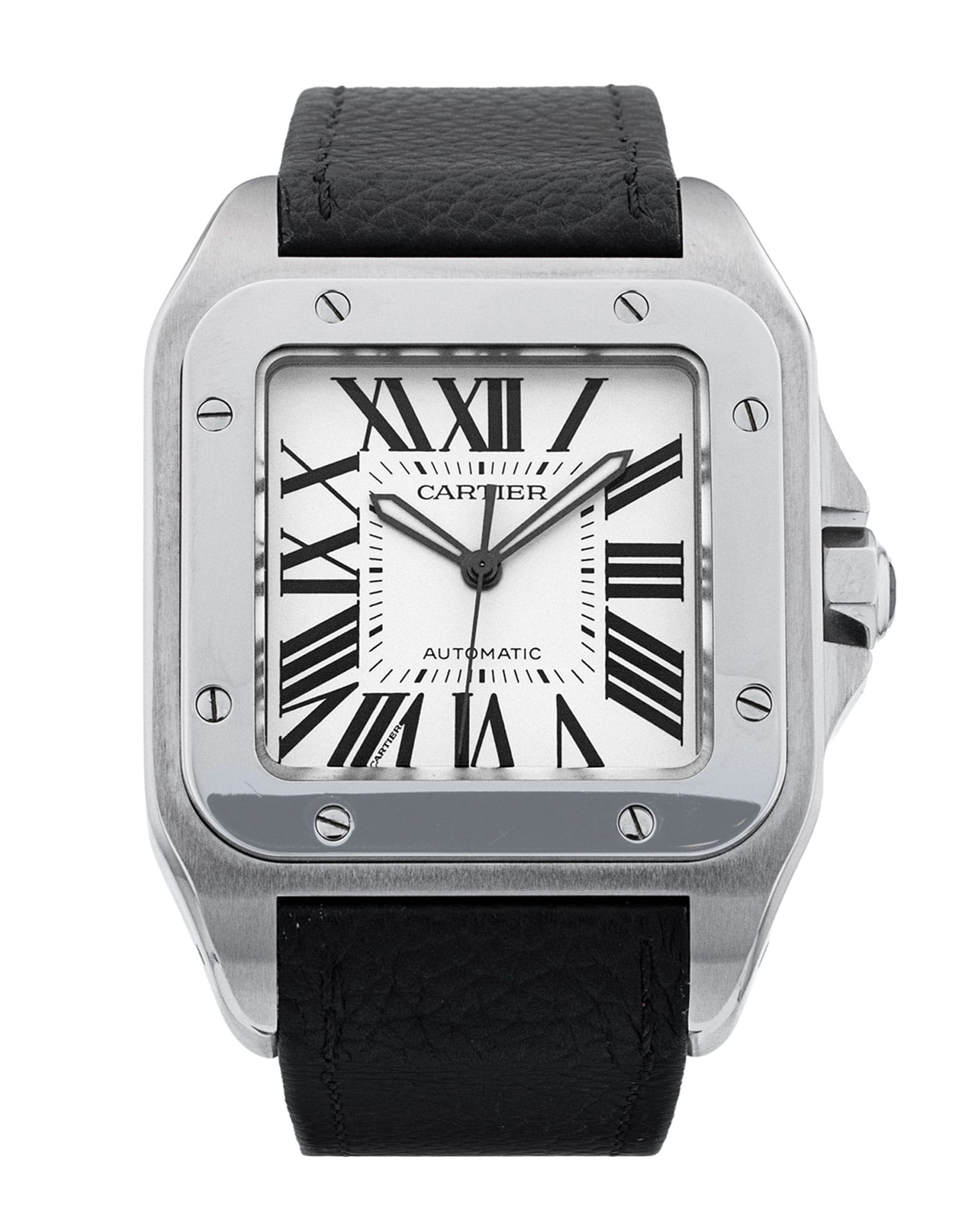 This Cartier Santos 100 W20073X8 has a silver roman numeral dial and a leather strap. This Cartier has undergone a thorough inspection of accuracy, functionality and condition at our Cartier certified service centre to determine the level of reconditioning required to meet our strict standards. It has also been checked against our records to ensure authenticity. All our watches have a 24-month warranty for your peace of mind.