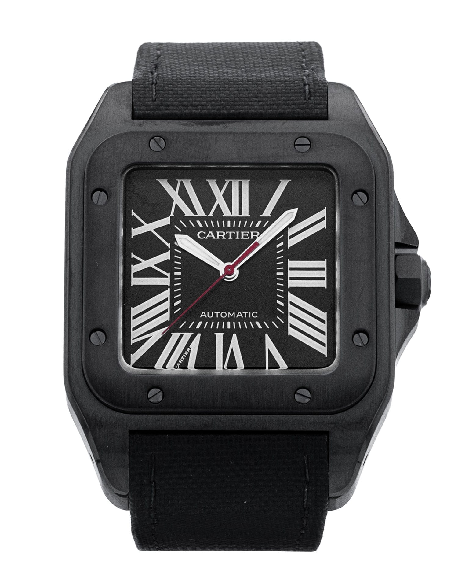 This Cartier Santos 100 WSSA0006 has a black roman numeral dial and a leather strap. This Cartier has undergone a thorough inspection of accuracy, functionality and condition at our Cartier certified service centre to determine the level of reconditioning required to meet our strict standards. It has also been checked against our records to ensure authenticity. All our watches have a 24-month warranty for your peace of mind.