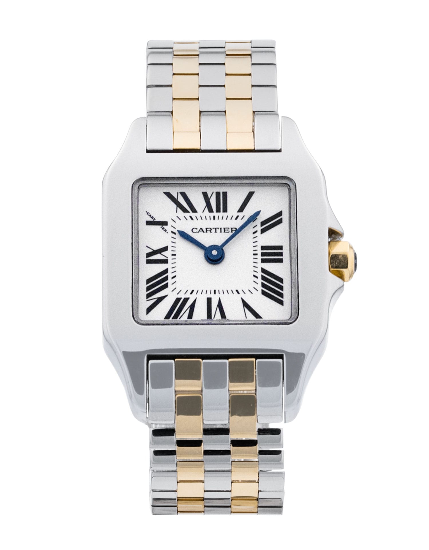 This Cartier Santos Demoiselle W25066Z6 has a silver roman numeral dial and a bracelet strap. This Cartier has undergone a thorough inspection of accuracy, functionality and condition at our Cartier certified service centre to determine the level of reconditioning required to meet our strict standards. It has also been checked against our records to ensure authenticity. All our watches have a 24-month warranty for your peace of mind.