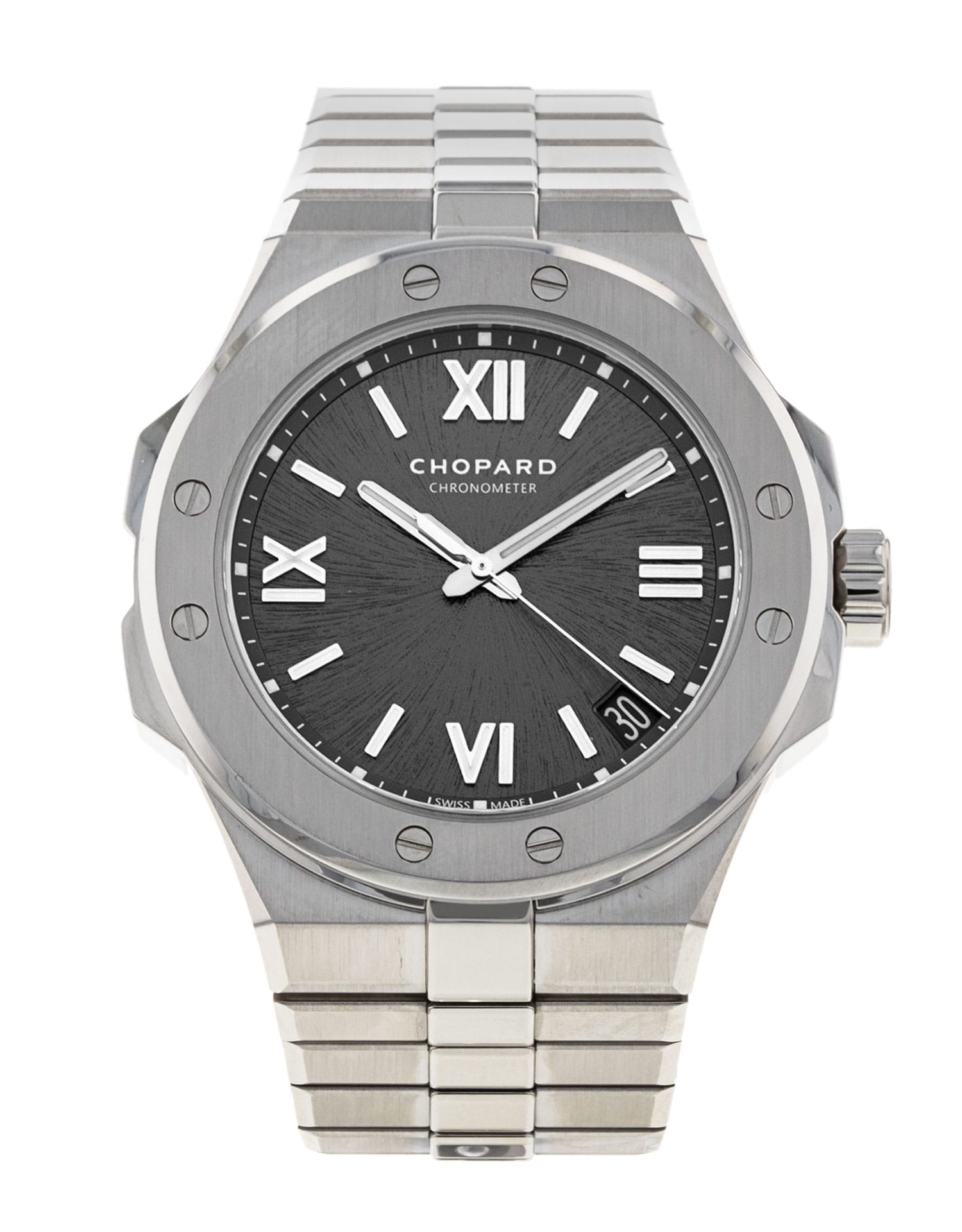 This Chopard Alpine Eagle 298600-3005 has a grey baton dial and a bracelet strap. This Chopard has undergone a thorough inspection of water resistance, accuracy, functionality and condition to determine the level of reconditioning required to meet our strict standards. It has also been referenced against technical documents and manufacturer records where available to ensure authenticity and a clean history. All our watches have a 24-month warranty for your peace of mind.