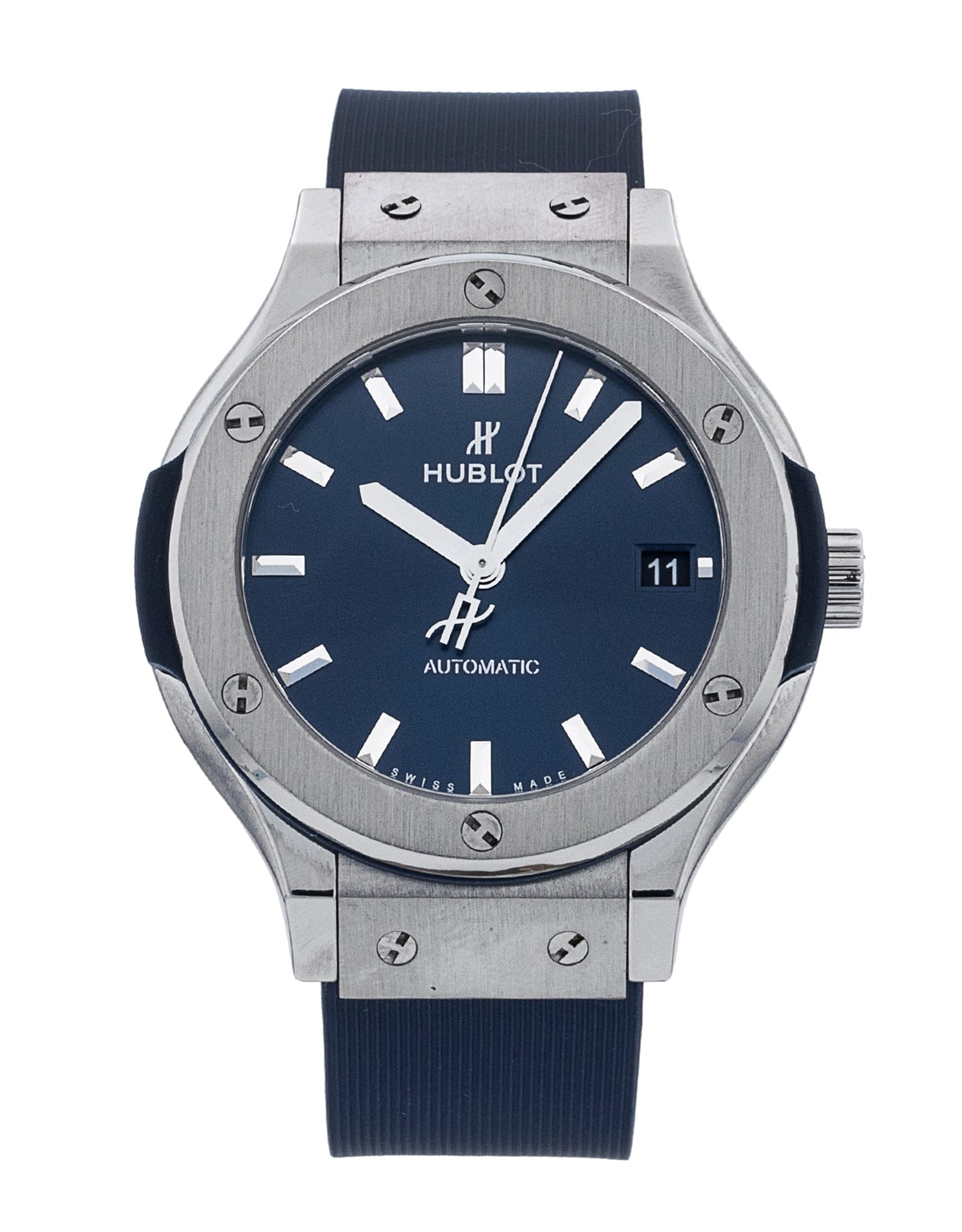 This Hublot Classic Fusion 565.NX.7170.LR has a blue dial and a rubber strap. This Hublot has undergone a thorough inspection of water resistance, accuracy, functionality and condition to determine the level of reconditioning required to meet our strict standards. It has also been referenced against technical documents and manufacturer records where available to ensure authenticity and a clean history. All our watches have a 24-month warranty for your peace of mind.