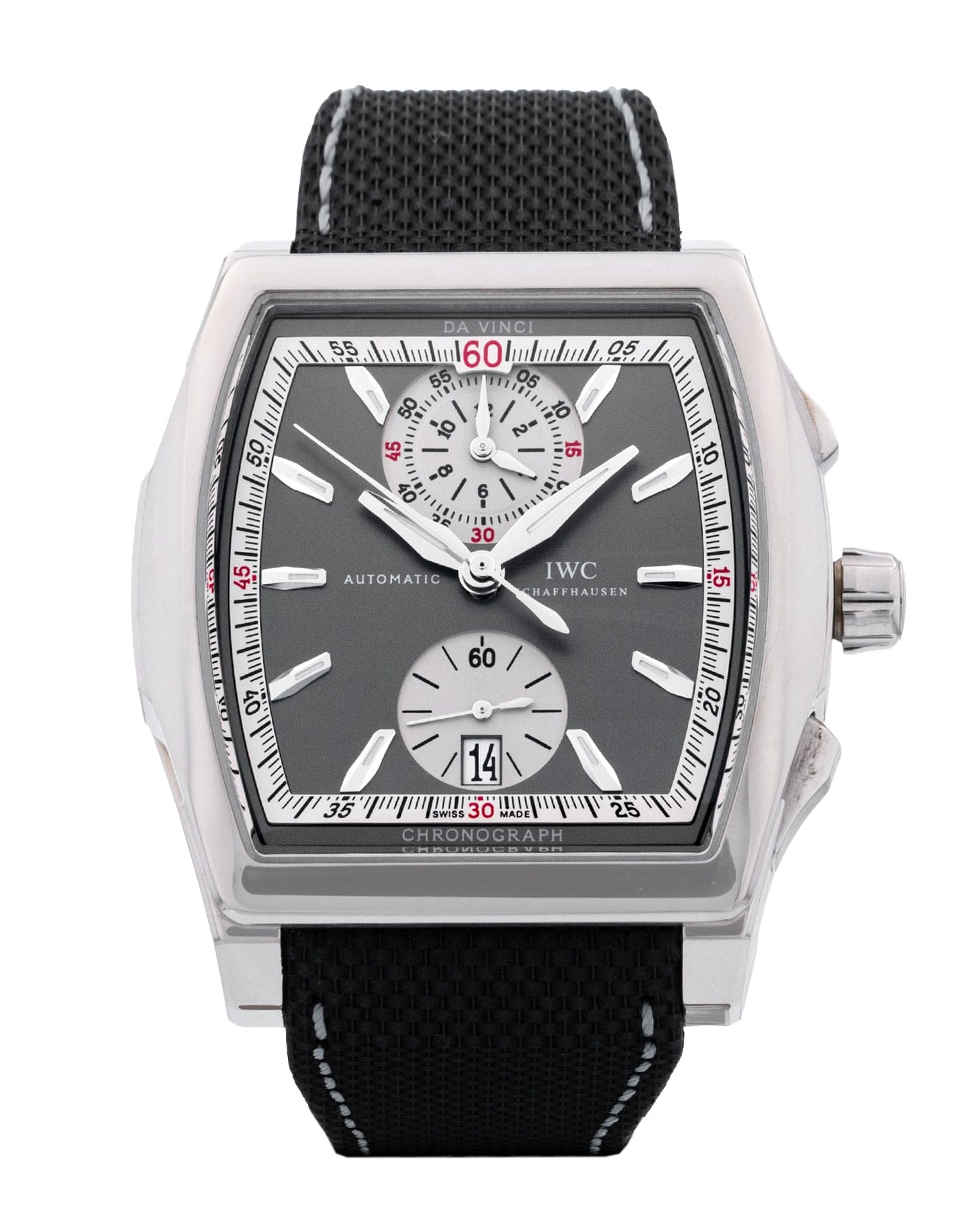 This IWC Da Vinci Chronograph IW376401 has a grey baton dial and a fabric strap. This IWC has undergone a thorough inspection of accuracy, functionality and condition at our IWC certified service centre to determine the level of reconditioning required to meet our strict standards. It has also been checked against our records to ensure authenticity. All our watches have a 24-month warranty for your peace of mind.