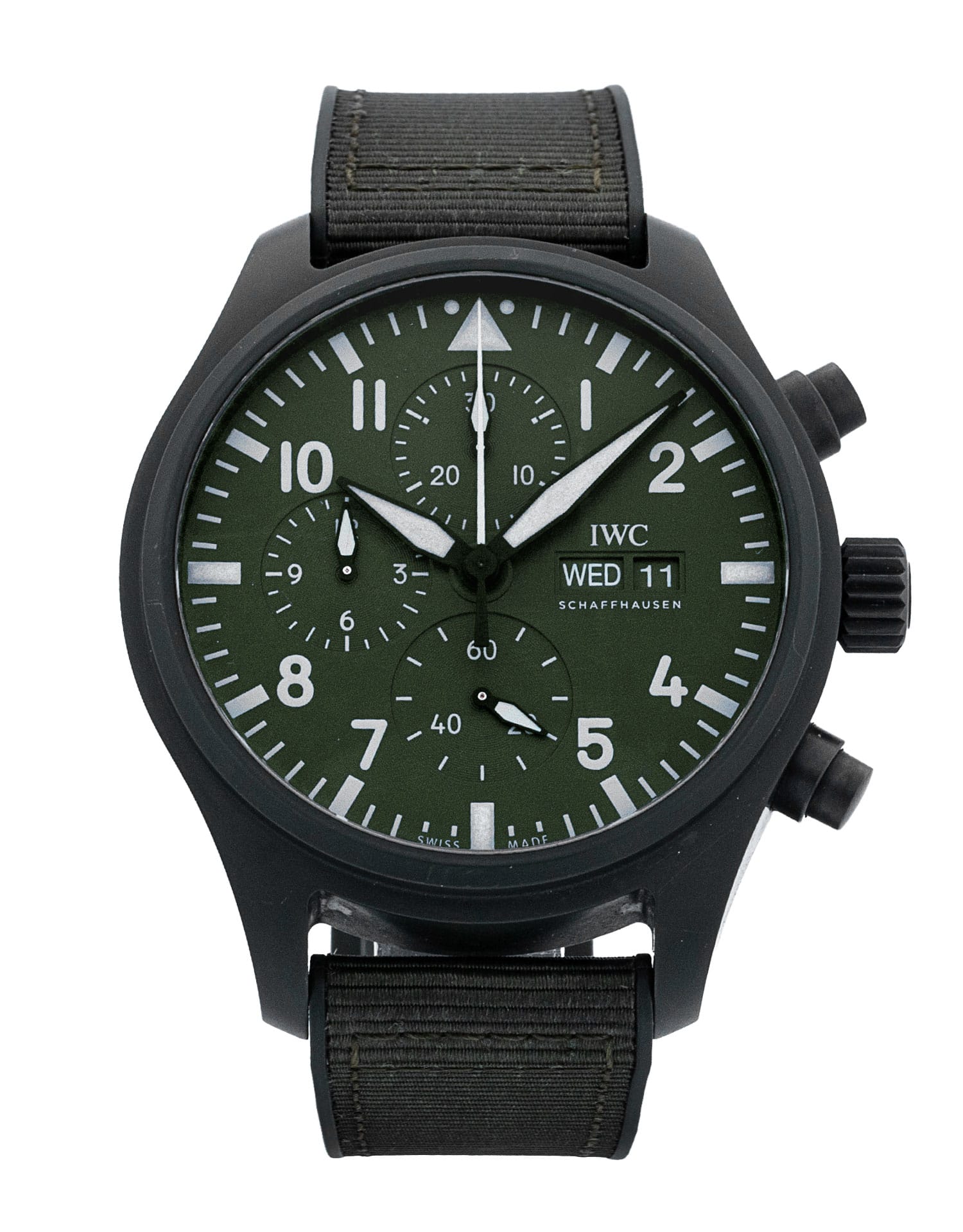 This IWC Pilot's Chrono IW389106 has a green arabic dial and a rubber strap. This IWC has undergone a thorough inspection of accuracy, functionality and condition at our IWC certified service centre to determine the level of reconditioning required to meet our strict standards. It has also been checked against our records to ensure authenticity. All our watches have a 24-month warranty for your peace of mind.