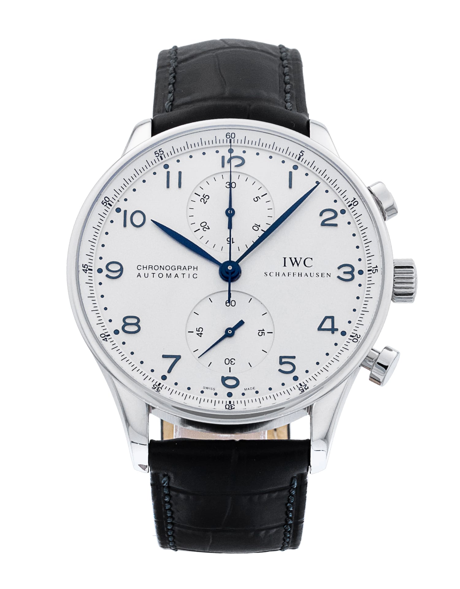 This IWC Portugieser Chrono IW371417 has a silver arabic dial and a leather strap. This IWC has undergone a thorough inspection of accuracy, functionality and condition at our IWC certified service centre to determine the level of reconditioning required to meet our strict standards. It has also been checked against our records to ensure authenticity. All our watches have a 24-month warranty for your peace of mind.