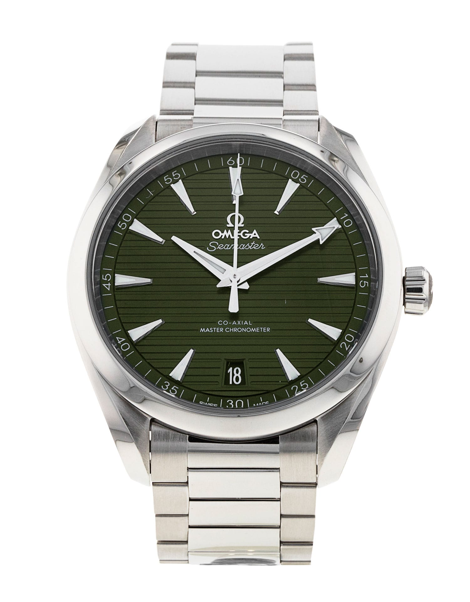 This Omega Aqua Terra 150m Gents 220.10.41.21.10.001 has a green baton dial and a bracelet strap. This Omega has undergone a thorough inspection of accuracy, functionality and condition at our Omega certified service centre to determine the level of reconditioning required to meet our strict standards. It has also been checked against our records to ensure authenticity. Our watches have a 24-month warranty for your peace of mind, in conjunction with any remaining manufacturer’s warranty from new or from service.