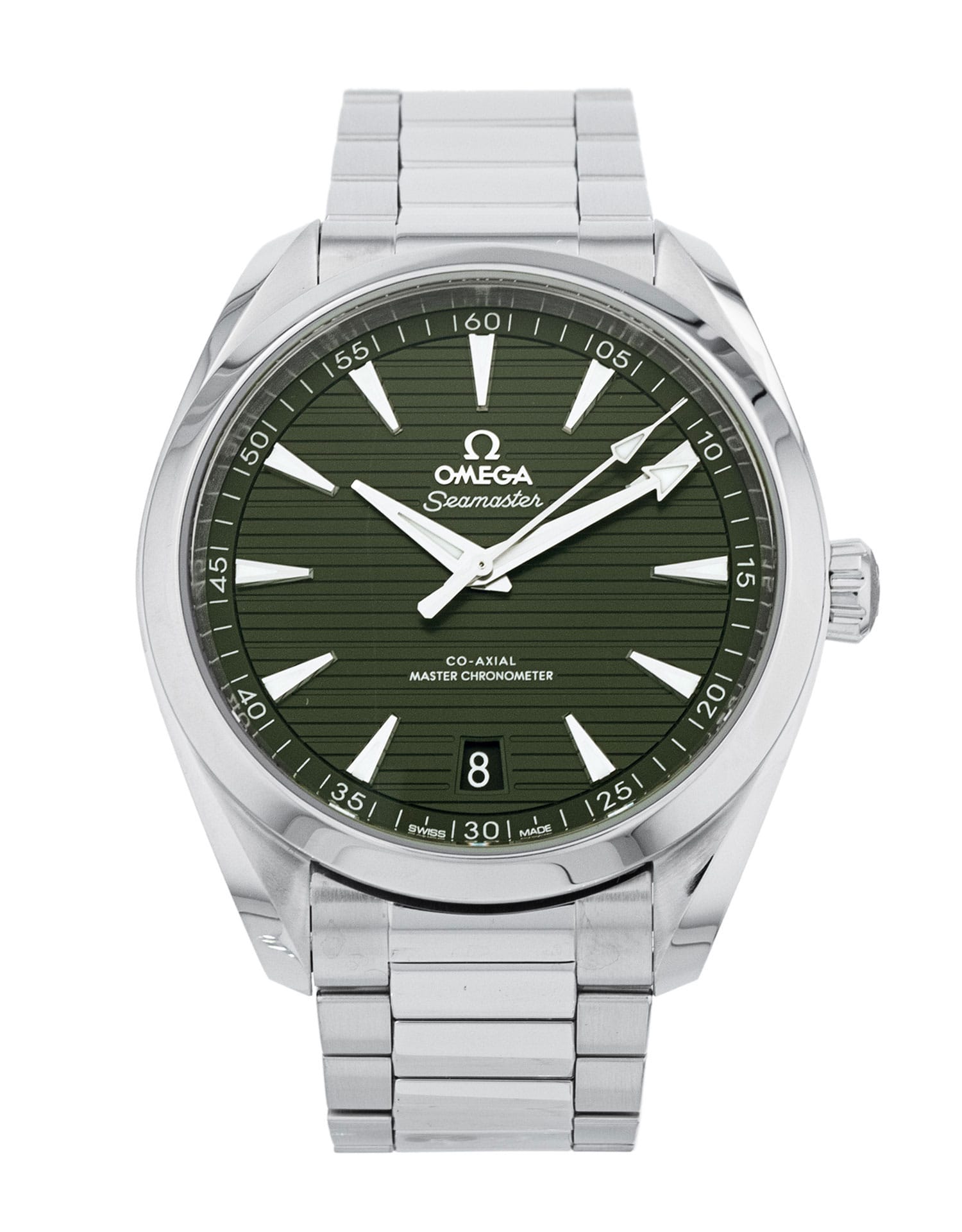 This Omega Aqua Terra 150m Gents 220.10.41.21.10.001 has a green baton dial and a bracelet strap. This Omega has undergone a thorough inspection of accuracy, functionality and condition at our Omega certified service centre to determine the level of reconditioning required to meet our strict standards. It has also been checked against our records to ensure authenticity. All our watches have a 24-month warranty for your peace of mind.