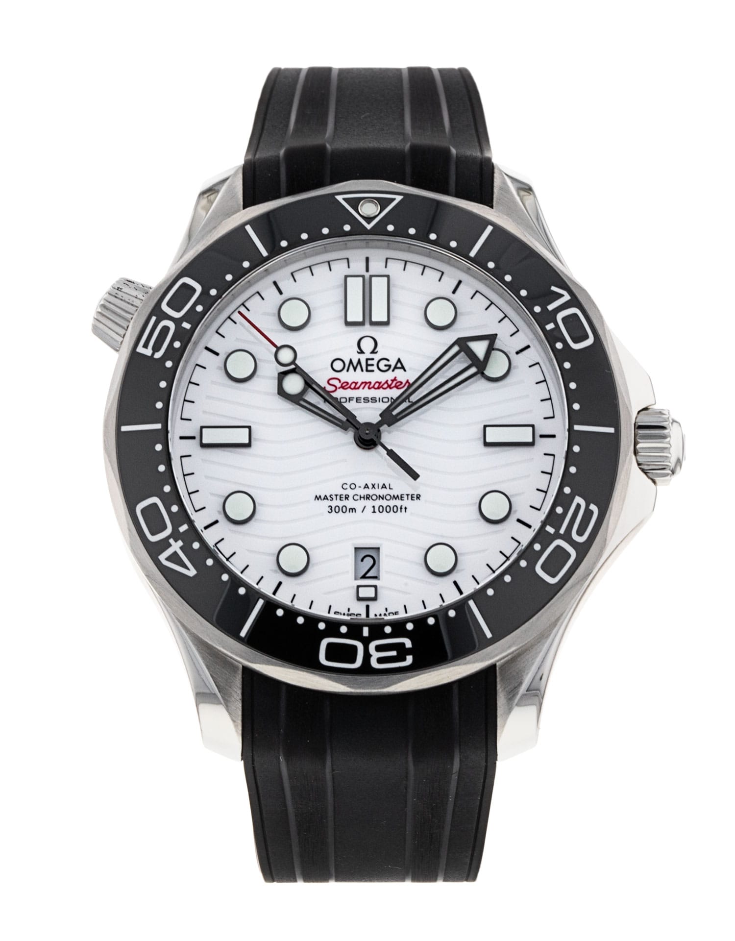 This Omega Seamaster Diver 300m 210.32.42.20.04.001 has a white dial and a rubber strap. This Omega has undergone a thorough inspection of accuracy, functionality and condition at our Omega certified service centre to determine the level of reconditioning required to meet our strict standards. It has also been checked against our records to ensure authenticity. All our watches have a 24-month warranty for your peace of mind.