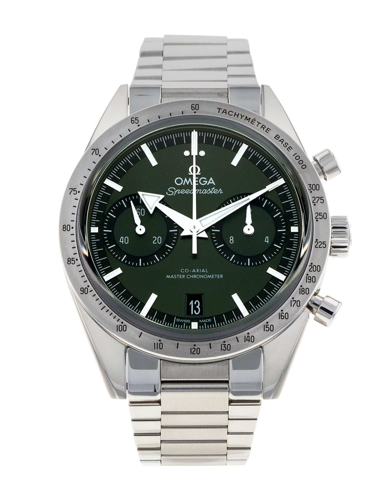 This Omega Speedmaster 57 332.10.41.51.10.001 has a green baton dial and a bracelet strap. This Omega has undergone a thorough inspection of accuracy, functionality and condition at our Omega certified service centre to determine the level of reconditioning required to meet our strict standards. It has also been checked against our records to ensure authenticity. Our watches have a 24-month warranty for your peace of mind, in conjunction with any remaining manufacturer’s warranty from new or from service.
