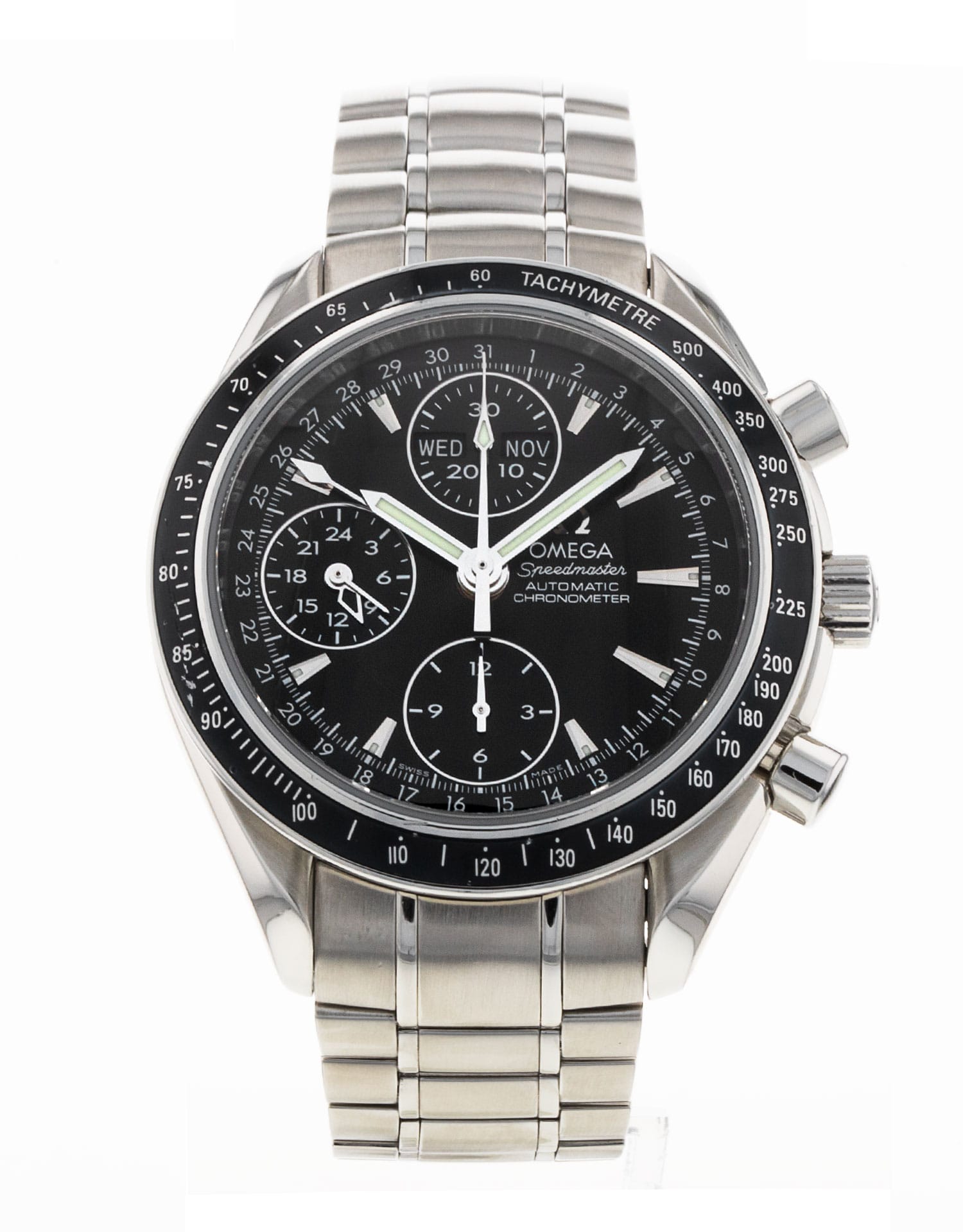 This Omega Speedmaster DayDate 3220.50.00 has a black baton dial and a bracelet strap. This Omega has undergone a thorough inspection of accuracy, functionality and condition at our Omega certified service centre to determine the level of reconditioning required to meet our strict standards. It has also been checked against our records to ensure authenticity. All our watches have a 24-month warranty for your peace of mind.