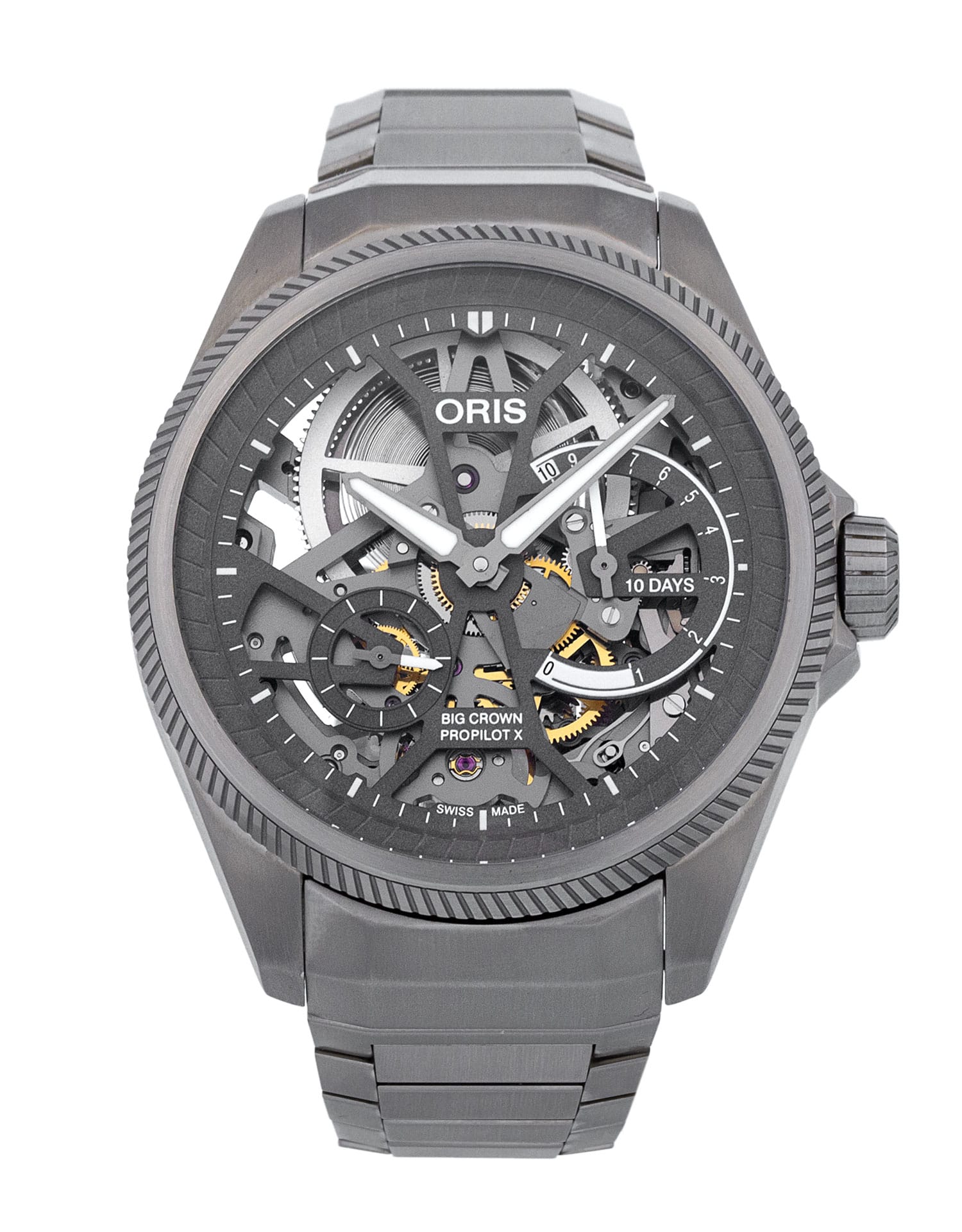 This Oris Big Crown ProPilot 115 7759 71 53 TLC has a skeleton dial and a bracelet strap. This Oris has undergone a thorough inspection of water resistance, accuracy, functionality and condition to determine the level of reconditioning required to meet our strict standards. It has also been referenced against technical documents and manufacturer records where available to ensure authenticity and a clean history. All our watches have a 24-month warranty for your peace of mind.