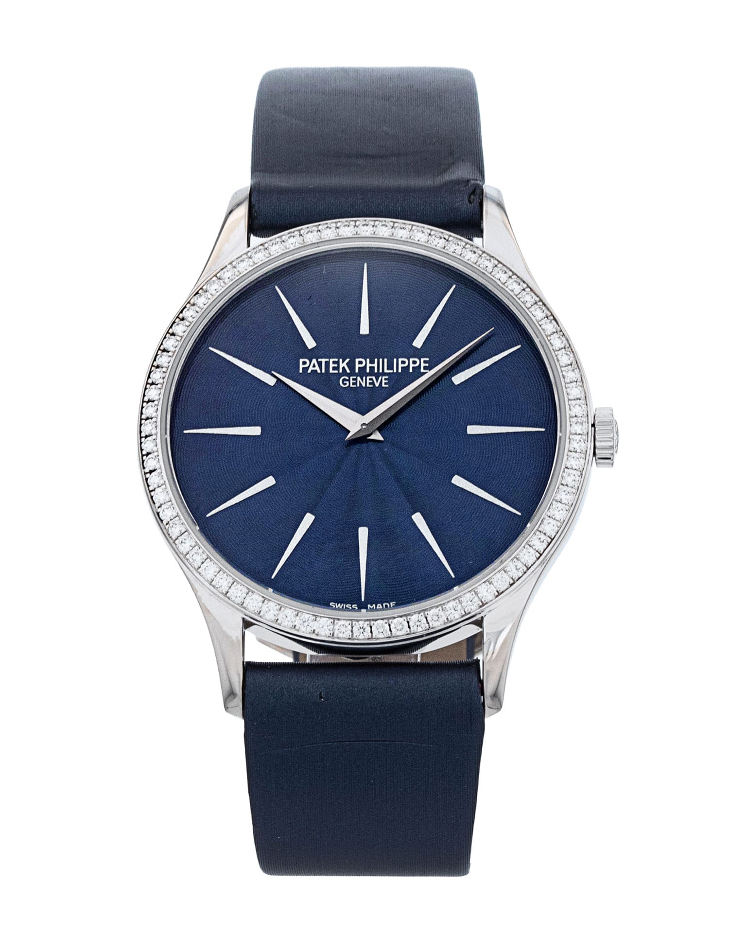 This Patek Philippe Calatrava 4897/300G-001 has a blue baton dial and a fabric strap. This Patek Philippe has undergone a thorough inspection of water resistance, accuracy, functionality and condition to determine the level of reconditioning required to meet our strict standards. It has also been referenced against technical documents and manufacturer records where available to ensure authenticity and a clean history. All our watches have a 24-month warranty for your peace of mind.