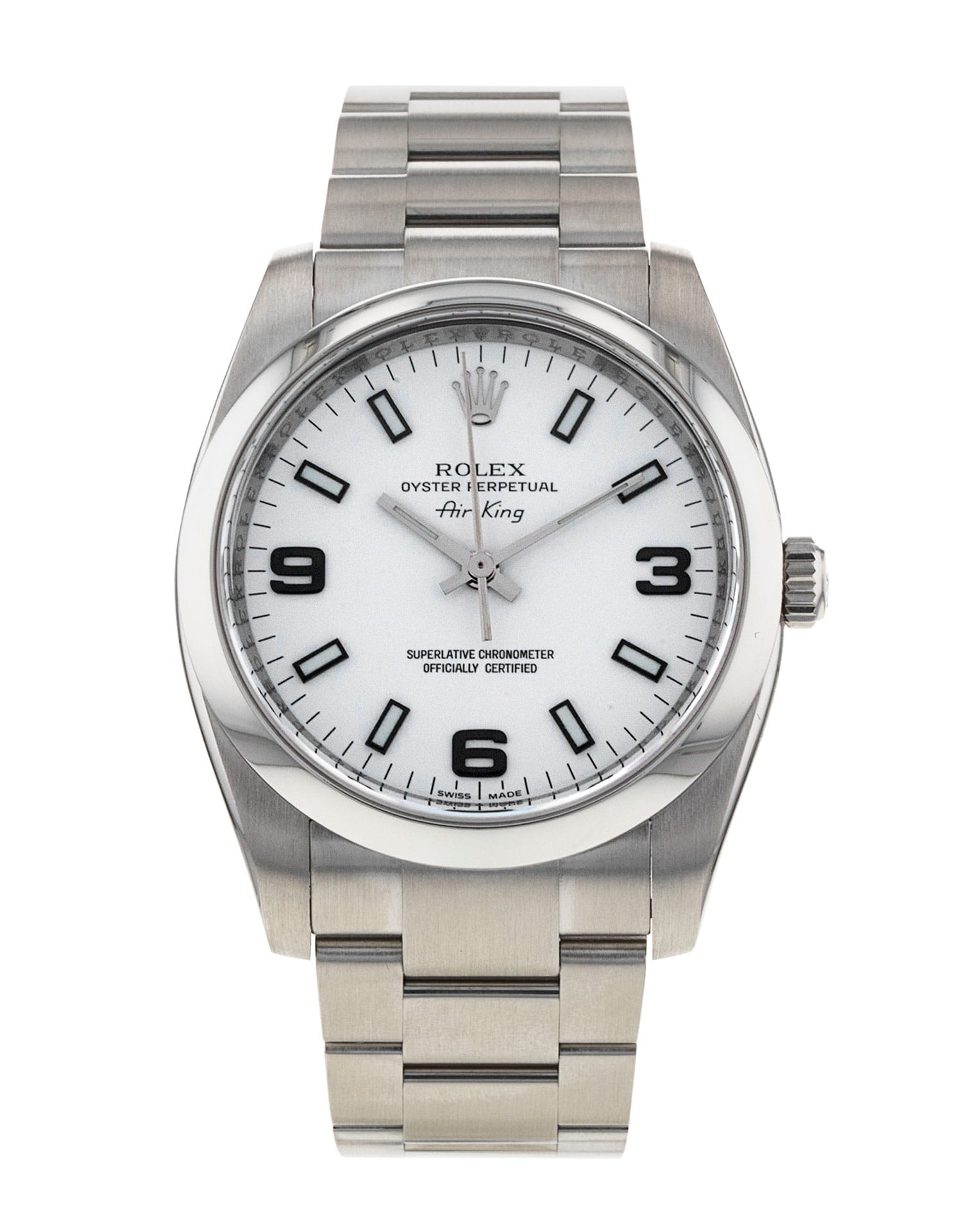 This Rolex Air-King 114200 has a white quarter arabic dial and a bracelet strap. This Rolex has undergone a thorough inspection of water resistance, accuracy, functionality and condition to determine the level of reconditioning required to meet our strict standards. It has also been referenced against technical documents and manufacturer records where available to ensure authenticity and a clean history. All our watches have a 24-month warranty for your peace of mind. One of our skilled polishing technicians has removed marks on the case and bracelet of this watch, brought about by daily wear and tear, which is why this watch does not come with the remaining manufacturer’s warranty.