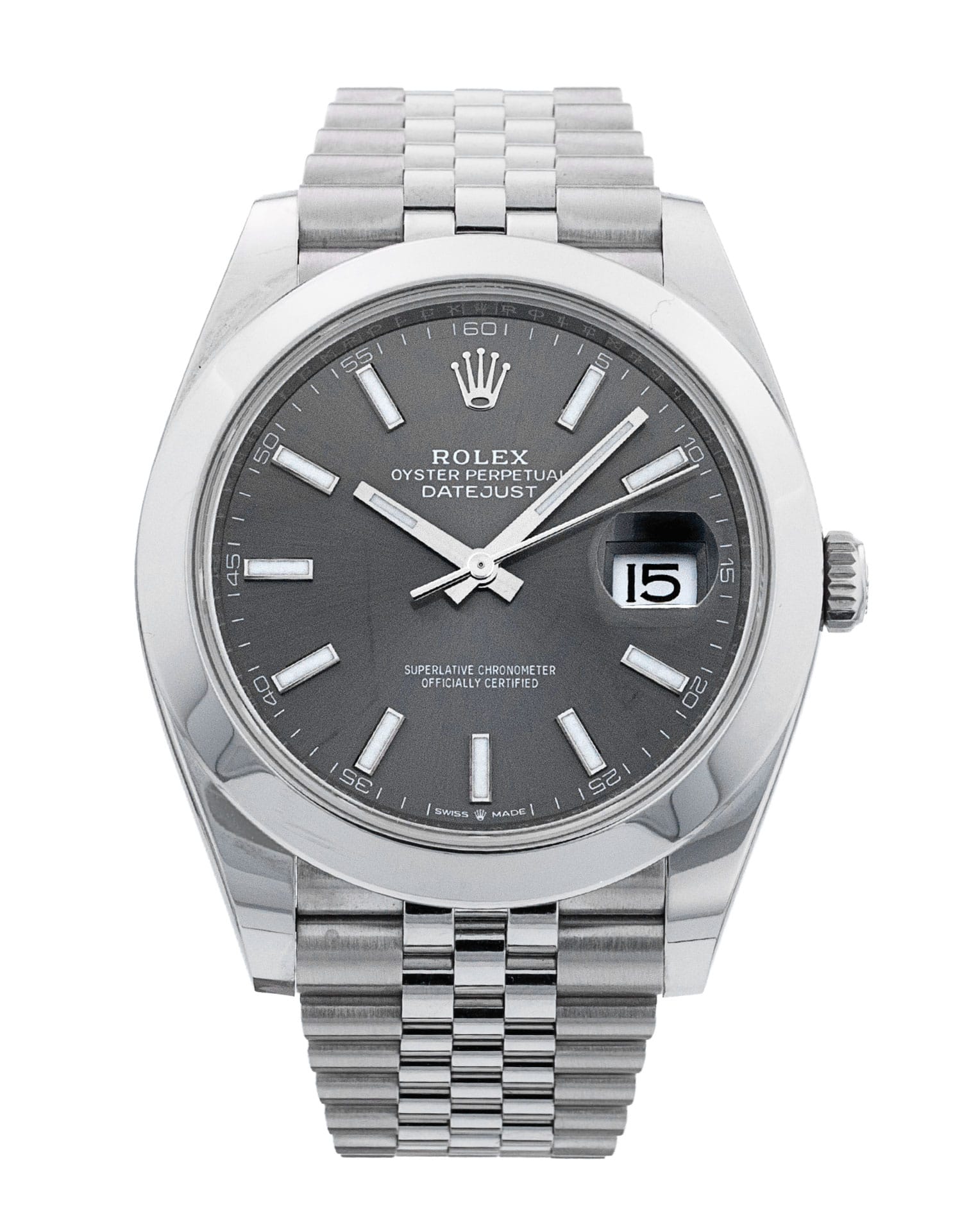 This Rolex Datejust 41 126300 has a slate baton dial and a bracelet strap. This Rolex has undergone a thorough inspection of water resistance, accuracy, functionality and condition to determine the level of reconditioning required to meet our strict standards. It has also been referenced against technical documents and manufacturer records where available to ensure authenticity and a clean history. Our watches have a 24-month warranty for your peace of mind, in conjunction with any remaining manufacturer’s warranty from new or from service. To maintain the manufacturer’s warranty on this watch, it has not been polished in our service centre.