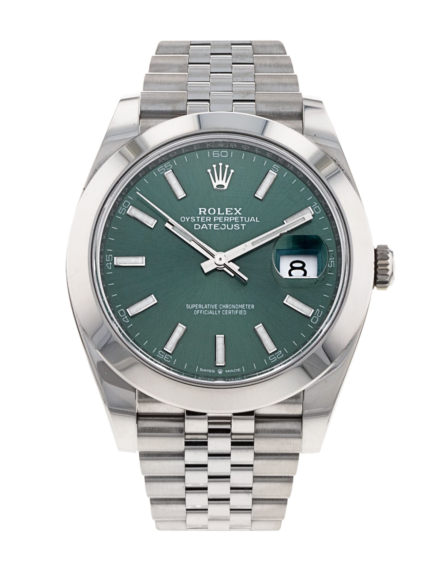 This Rolex Datejust 41 126300 has a mint green baton dial and a bracelet strap. This Rolex has undergone a thorough inspection of water resistance, accuracy, functionality and condition to determine the level of reconditioning required to meet our strict standards. It has also been referenced against technical documents and manufacturer records where available to ensure authenticity and a clean history. Our watches have a 24-month warranty for your peace of mind, in conjunction with any remaining manufacturer’s warranty from new or from service. To maintain the manufacturer’s warranty on this watch, it has not been polished in our service centre.