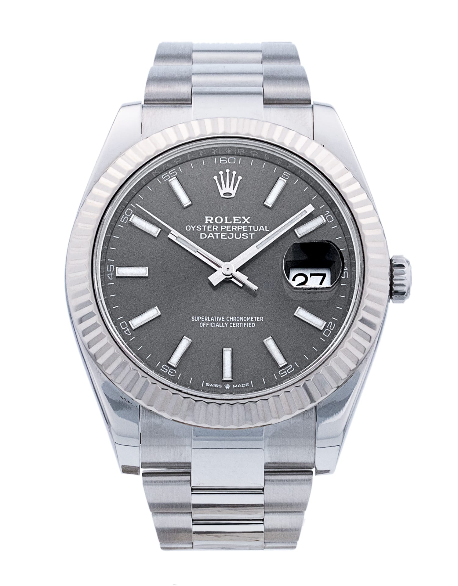 This Rolex Datejust 41 126334 has a rhodium baton dial and a bracelet strap. This Rolex has undergone a thorough inspection of water resistance, accuracy, functionality and condition to determine the level of reconditioning required to meet our strict standards. It has also been referenced against technical documents and manufacturer records where available to ensure authenticity and a clean history. All our watches have a 24-month warranty for your peace of mind. One of our skilled polishing technicians has removed marks on the case and bracelet of this watch, brought about by daily wear and tear, which is why this watch does not come with the remaining manufacturer’s warranty.
