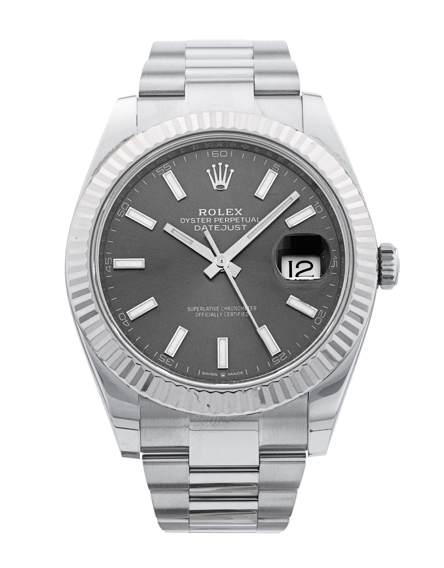 This Rolex Datejust 41 126334 has a rhodium baton dial and a bracelet strap. This Rolex has undergone a thorough inspection of water resistance, accuracy, functionality and condition to determine the level of reconditioning required to meet our strict standards. It has also been referenced against technical documents and manufacturer records where available to ensure authenticity and a clean history. All our watches have a 24-month warranty for your peace of mind. One of our skilled polishing technicians has removed marks on the case and bracelet of this watch, brought about by daily wear and tear, which is why this watch does not come with the remaining manufacturer’s warranty.