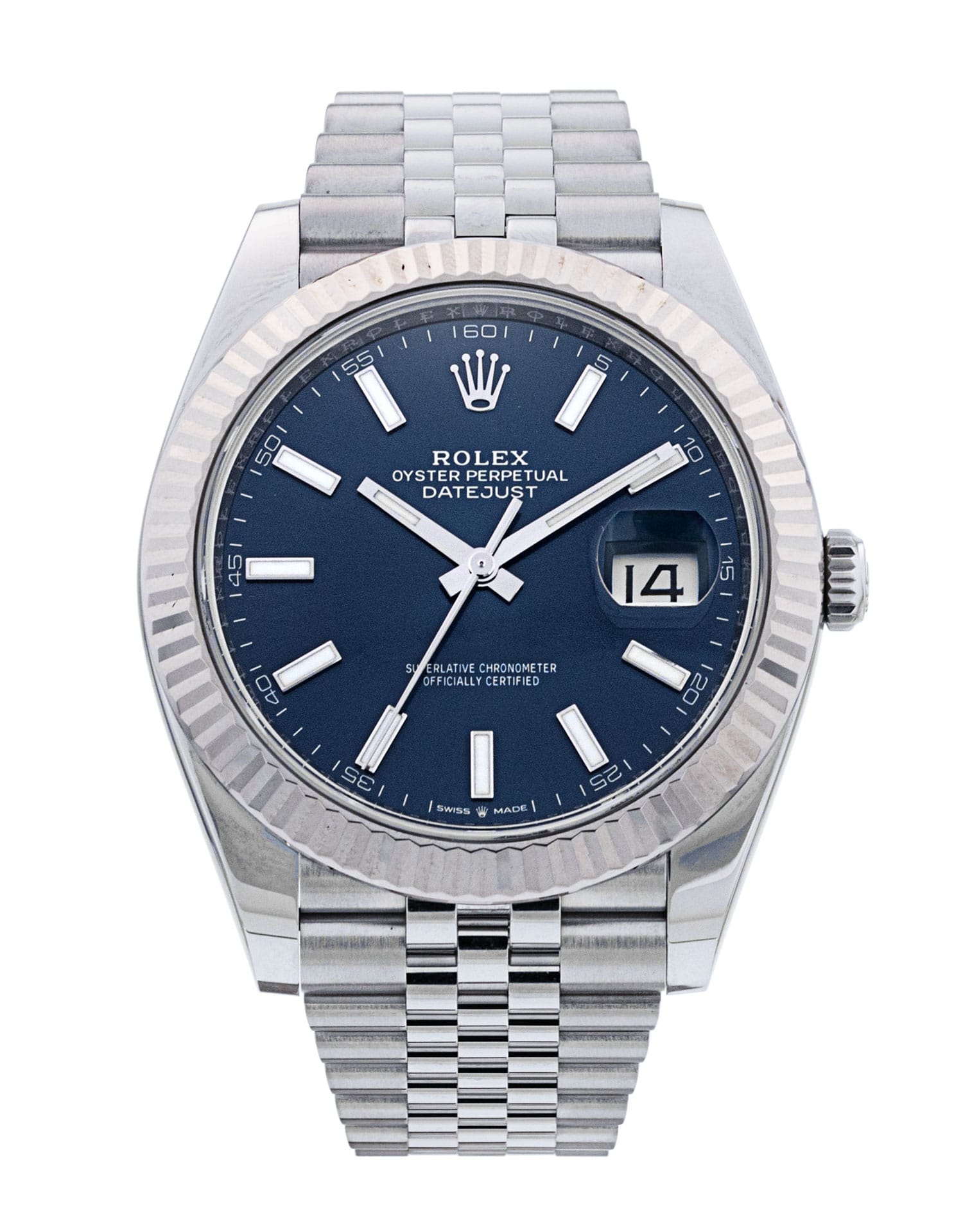 This Rolex Datejust 41 126334 has a blue baton dial and a bracelet strap. This Rolex has undergone a thorough inspection of water resistance, accuracy, functionality and condition to determine the level of reconditioning required to meet our strict standards. It has also been referenced against technical documents and manufacturer records where available to ensure authenticity and a clean history. Our watches have a 24-month warranty for your peace of mind, in conjunction with any remaining manufacturer’s warranty from new or from service. To maintain the manufacturer’s warranty on this watch, it has not been polished in our service centre.