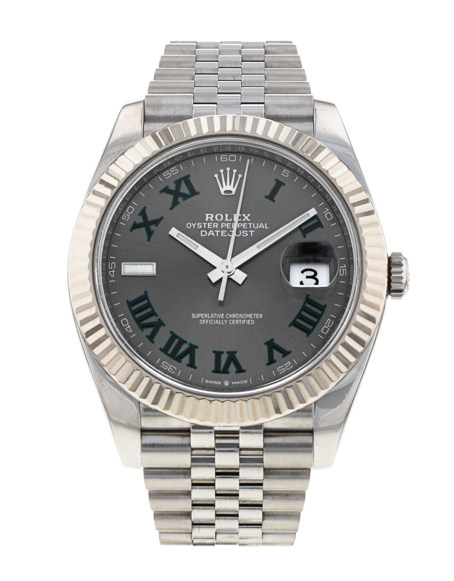 This Rolex Datejust 41 126334 has a slate roman numeral dial and a bracelet strap. This Rolex has undergone a thorough inspection of water resistance, accuracy, functionality and condition to determine the level of reconditioning required to meet our strict standards. It has also been referenced against technical documents and manufacturer records where available to ensure authenticity and a clean history. All our watches have a 24-month warranty for your peace of mind. One of our skilled polishing technicians has removed marks on the case and bracelet of this watch, brought about by daily wear and tear, which is why this watch does not come with the remaining manufacturer’s warranty.