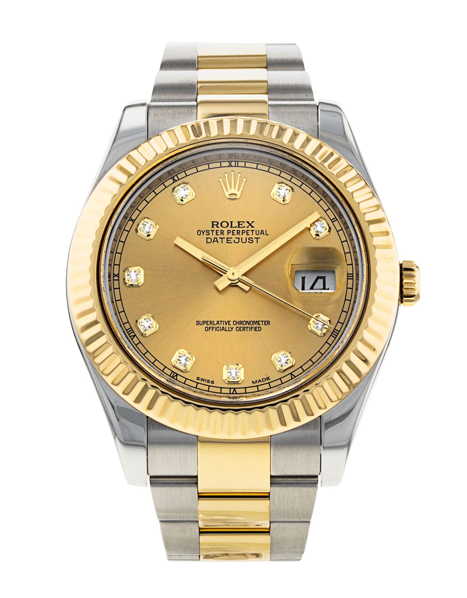 This Rolex Datejust II 116333 has a champagne diamond dial and a bracelet strap. This Rolex has undergone a thorough inspection of water resistance, accuracy, functionality and condition to determine the level of reconditioning required to meet our strict standards. It has also been referenced against technical documents and manufacturer records where available to ensure authenticity and a clean history. All our watches have a 24-month warranty for your peace of mind. One of our skilled polishing technicians has removed marks on the case and bracelet of this watch, brought about by daily wear and tear, which is why this watch does not come with the remaining manufacturer’s warranty.