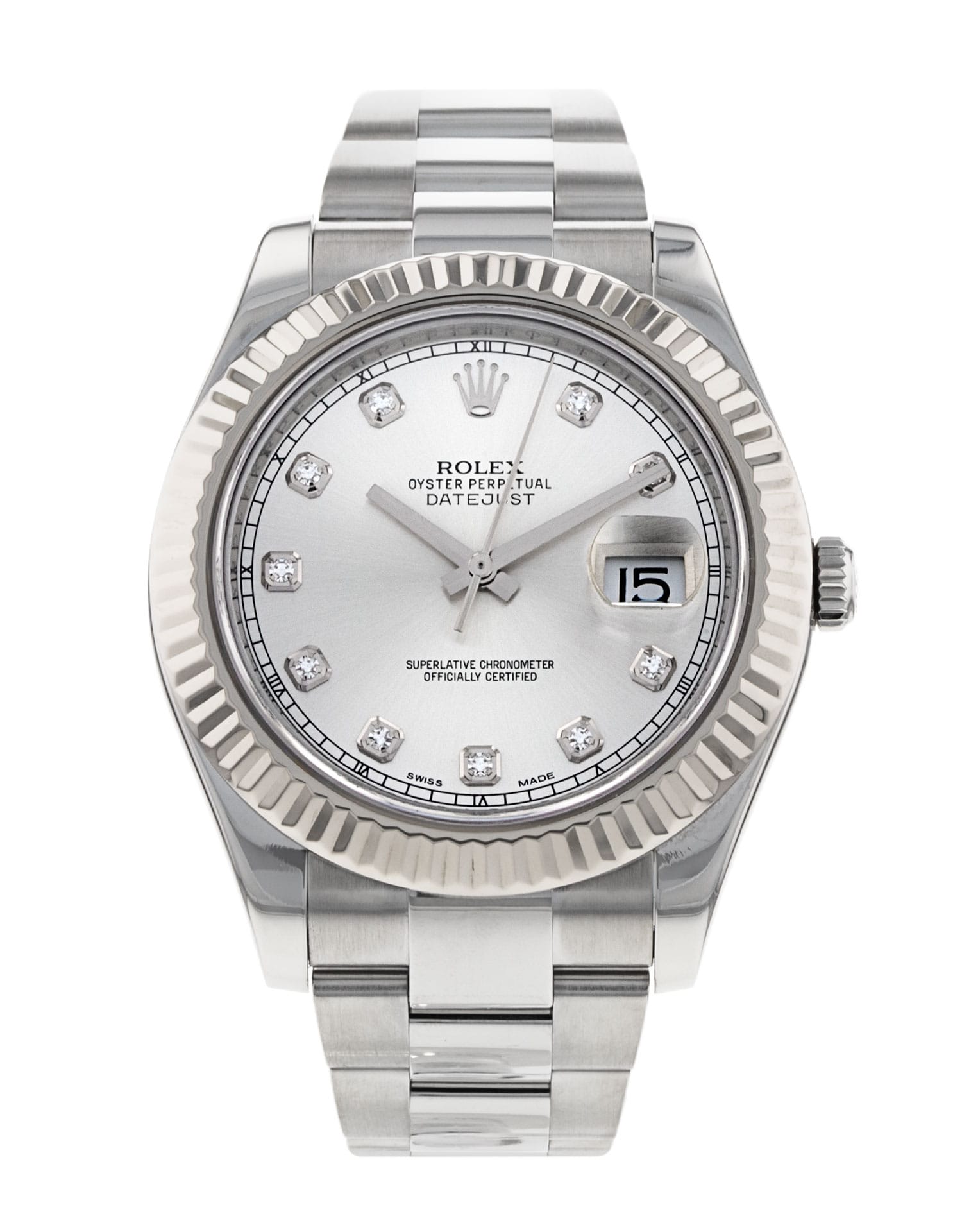 This Rolex Datejust II 116334 has a silver diamond dial and a bracelet strap. This Rolex has undergone a thorough inspection of water resistance, accuracy, functionality and condition to determine the level of reconditioning required to meet our strict standards. It has also been referenced against technical documents and manufacturer records where available to ensure authenticity and a clean history. All our watches have a 24-month warranty for your peace of mind. One of our skilled polishing technicians has removed marks on the case and bracelet of this watch, brought about by daily wear and tear, which is why this watch does not come with the remaining manufacturer’s warranty.