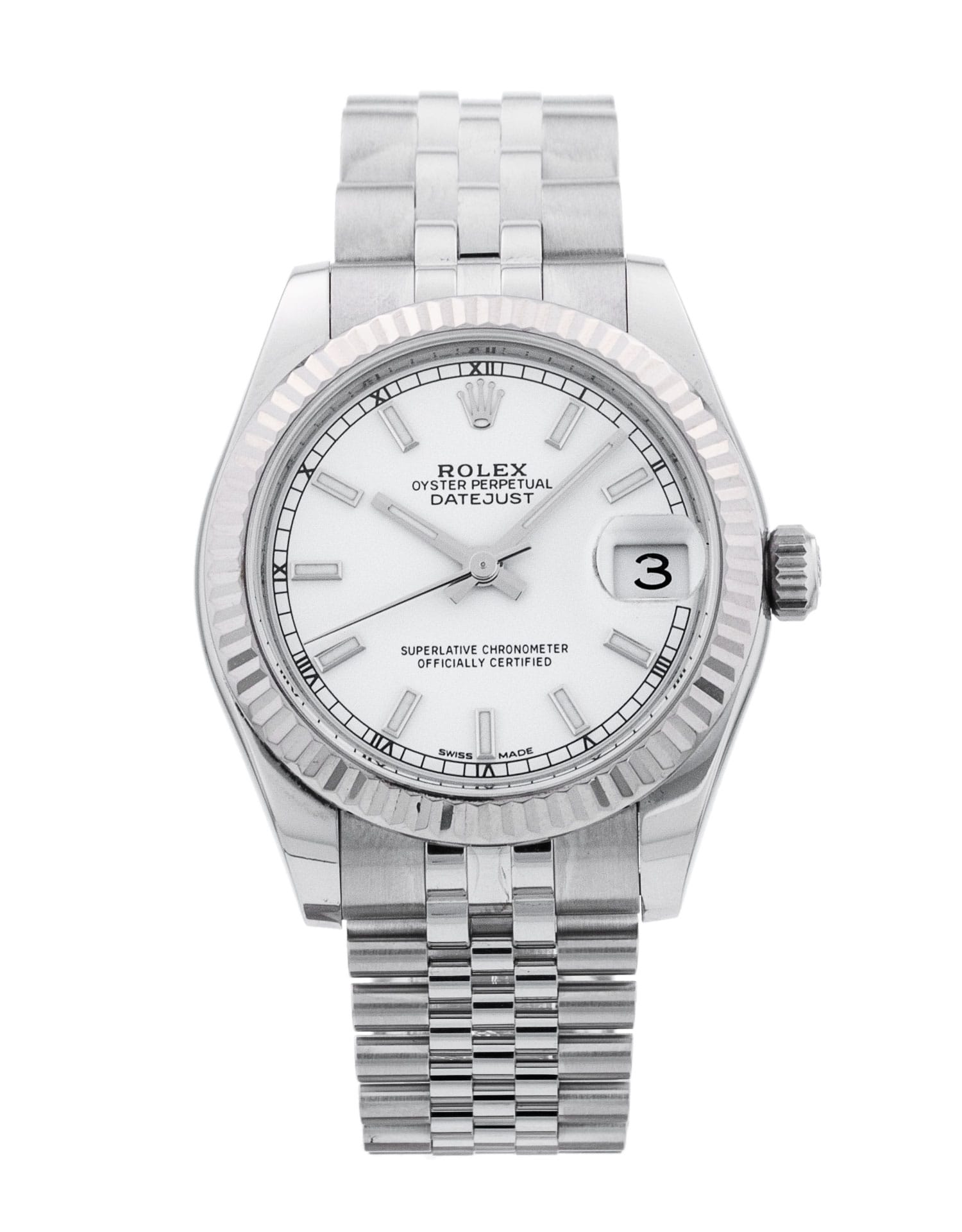 This Rolex Datejust Lady 31 178274 has a white baton dial and a bracelet strap. This Rolex has undergone a thorough inspection of water resistance, accuracy, functionality and condition to determine the level of reconditioning required to meet our strict standards. It has also been referenced against technical documents and manufacturer records where available to ensure authenticity and a clean history. All our watches have a 24-month warranty for your peace of mind. One of our skilled polishing technicians has removed marks on the case and bracelet of this watch, brought about by daily wear and tear, which is why this watch does not come with the remaining manufacturer’s warranty.