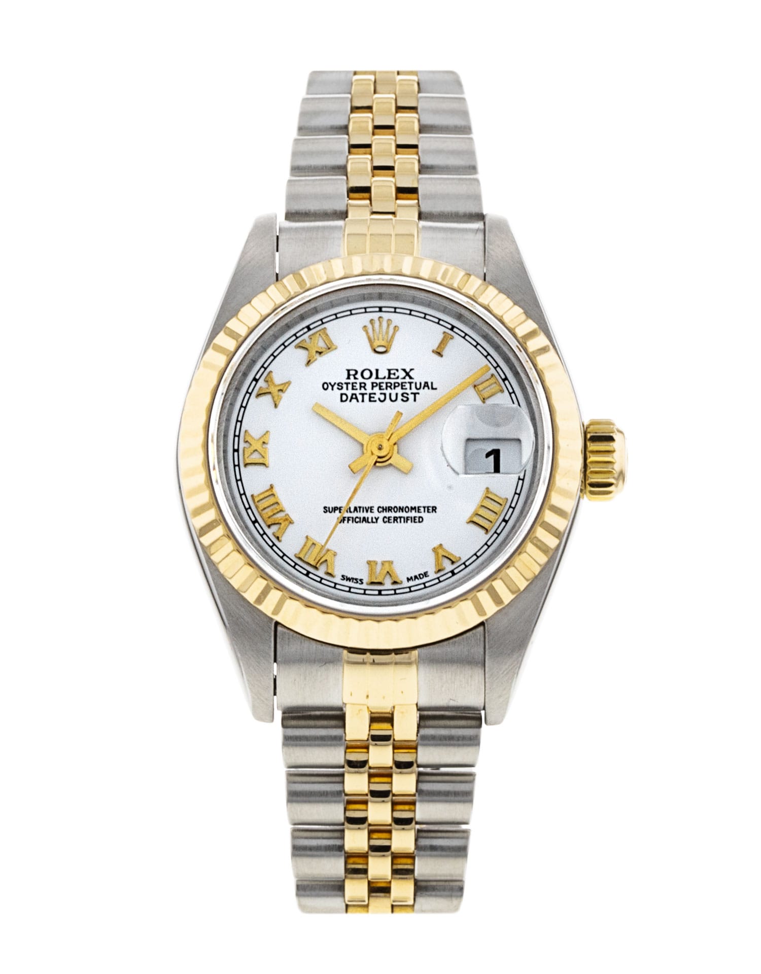 This Rolex Datejust Lady 79173 has a white roman numeral dial and a bracelet strap. This Rolex has undergone a thorough inspection of water resistance, accuracy, functionality and condition to determine the level of reconditioning required to meet our strict standards. It has also been referenced against technical documents and manufacturer records where available to ensure authenticity and a clean history. All our watches have a 24-month warranty for your peace of mind. One of our skilled polishing technicians has removed marks on the case and bracelet of this watch, brought about by daily wear and tear, which is why this watch does not come with the remaining manufacturer’s warranty.