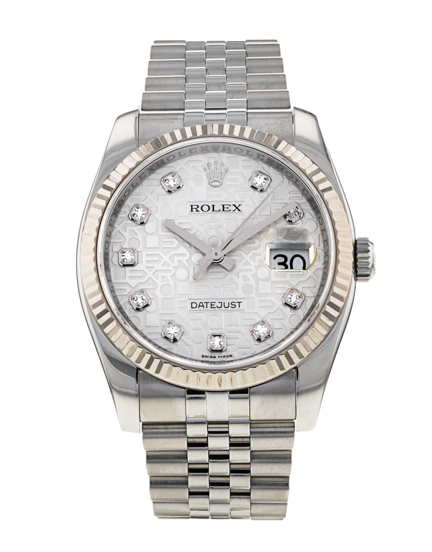 This Rolex Datejust 116234 has a silver jubilee diamond dial and a bracelet strap. This Rolex has undergone a thorough inspection of water resistance, accuracy, functionality and condition to determine the level of reconditioning required to meet our strict standards. It has also been referenced against technical documents and manufacturer records where available to ensure authenticity and a clean history. All our watches have a 24-month warranty for your peace of mind. One of our skilled polishing technicians has removed marks on the case and bracelet of this watch, brought about by daily wear and tear, which is why this watch does not come with the remaining manufacturer’s warranty.