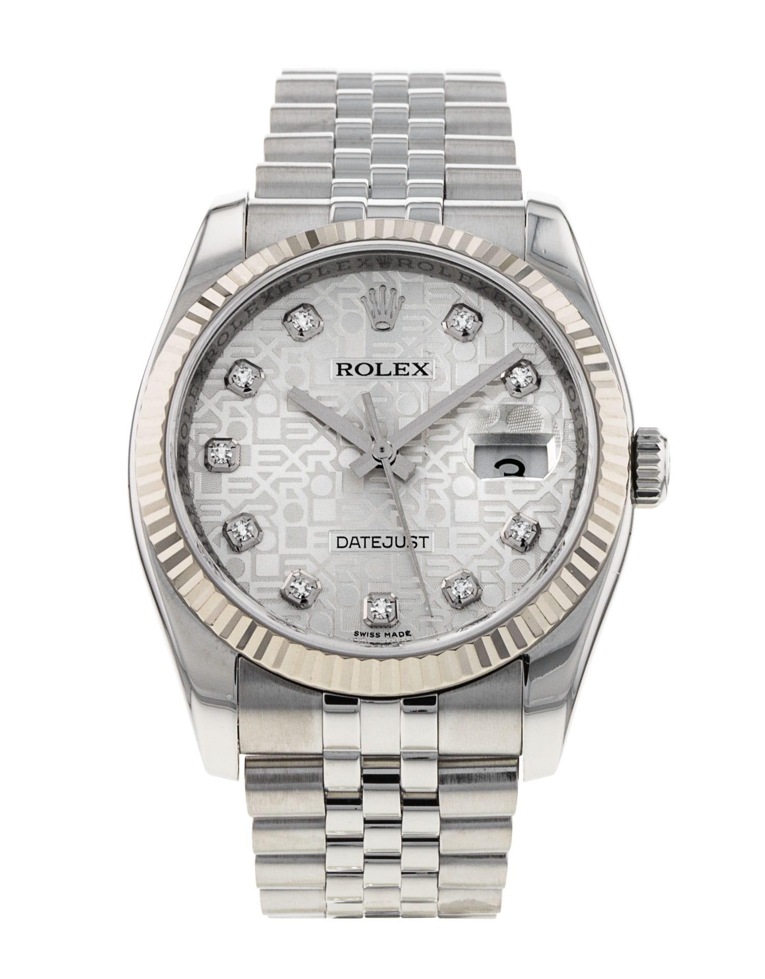 This Rolex Datejust 116234 has a silver jubilee diamond dial and a bracelet strap. This Rolex has undergone a thorough inspection of water resistance, accuracy, functionality and condition to determine the level of reconditioning required to meet our strict standards. It has also been referenced against technical documents and manufacturer records where available to ensure authenticity and a clean history. All our watches have a 24-month warranty for your peace of mind. One of our skilled polishing technicians has removed marks on the case and bracelet of this watch, brought about by daily wear and tear, which is why this watch does not come with the remaining manufacturer’s warranty.