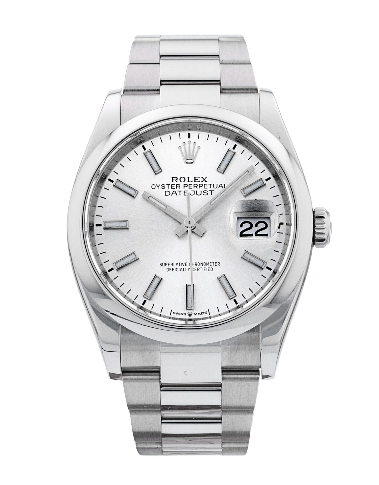 This Rolex Datejust 126200 has a silver baton dial and a bracelet strap. This Rolex has undergone a thorough inspection of water resistance, accuracy, functionality and condition to determine the level of reconditioning required to meet our strict standards. It has also been referenced against technical documents and manufacturer records where available to ensure authenticity and a clean history. All our watches have a 24-month warranty for your peace of mind. One of our skilled polishing technicians has removed marks on the case and bracelet of this watch, brought about by daily wear and tear, which is why this watch does not come with the remaining manufacturer’s warranty.
