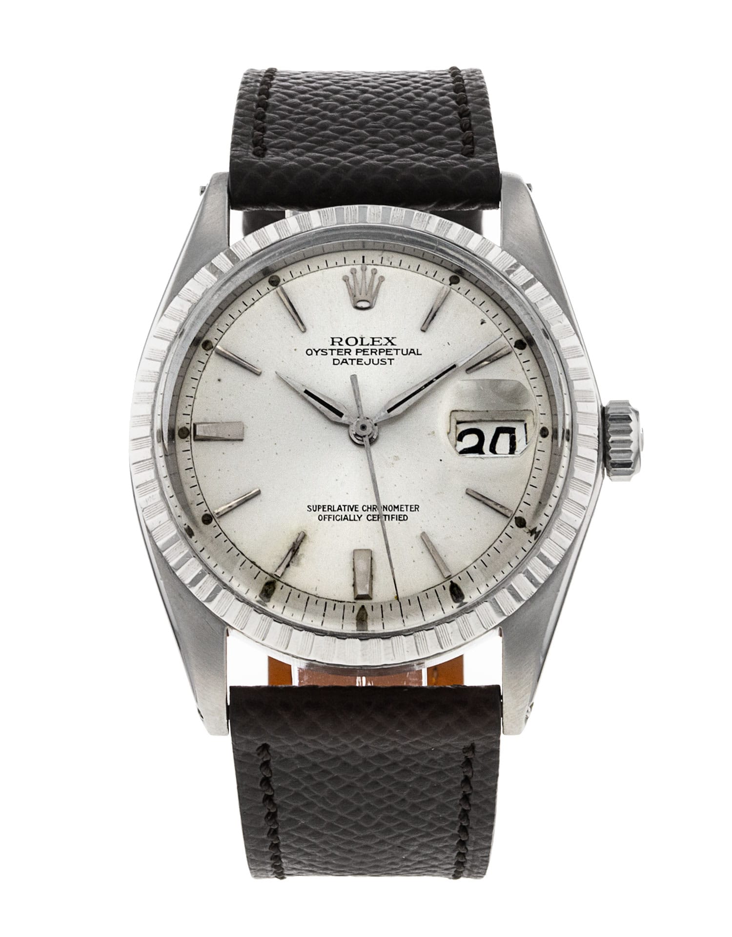 This Rolex Datejust 1603 has a silver baton dial and a leather strap. Due to age, this Rolex may not fall within our typical expected tolerances for timekeeping, and is no longer suitable for use in wet environments or submersion in water. In the interests of preserving original features, utmost care has been taken to sympathetically restore this watch. It has also been referenced against technical documents and manufacturer records where available to ensure authenticity and a clean history. One of our skilled polishing technicians has removed marks on the case and bracelet of this watch, brought about by daily wear and tear, which is why this watch does not come with the remaining manufacturer’s warranty.