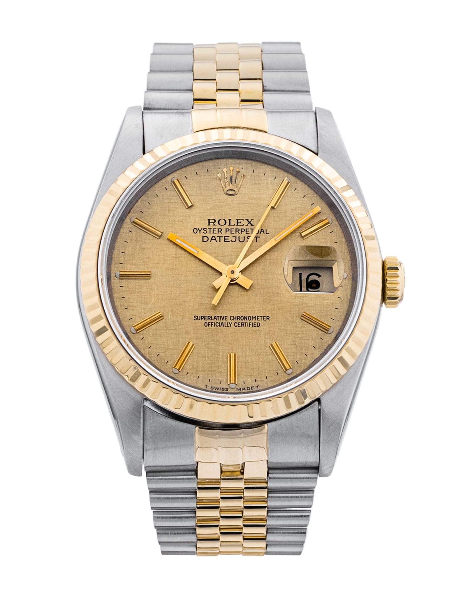 This Rolex Datejust 16233 has a champagne linen dial and a bracelet strap. This Rolex has undergone a thorough inspection of water resistance, accuracy, functionality and condition to determine the level of reconditioning required to meet our strict standards. It has also been referenced against technical documents and manufacturer records where available to ensure authenticity and a clean history. All our watches have a 24-month warranty for your peace of mind. One of our skilled polishing technicians has removed marks on the case and bracelet of this watch, brought about by daily wear and tear, which is why this watch does not come with the remaining manufacturer’s warranty.