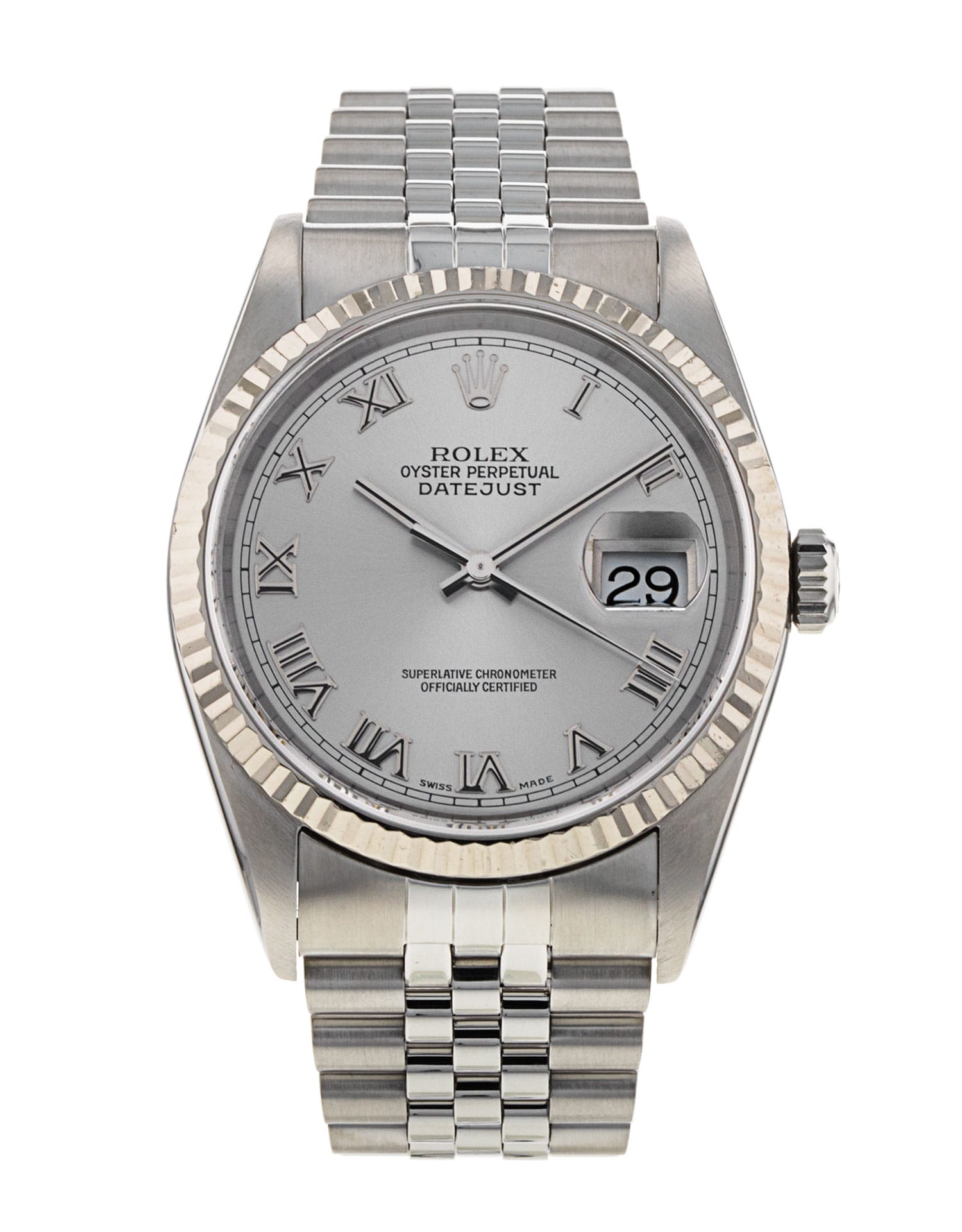 This Rolex Datejust 16234 has a silver roman numeral dial and a bracelet strap. This Rolex has undergone a thorough inspection of water resistance, accuracy, functionality and condition to determine the level of reconditioning required to meet our strict standards. It has also been referenced against technical documents and manufacturer records where available to ensure authenticity and a clean history. All our watches have a 24-month warranty for your peace of mind. One of our skilled polishing technicians has removed marks on the case and bracelet of this watch, brought about by daily wear and tear, which is why this watch does not come with the remaining manufacturer’s warranty.