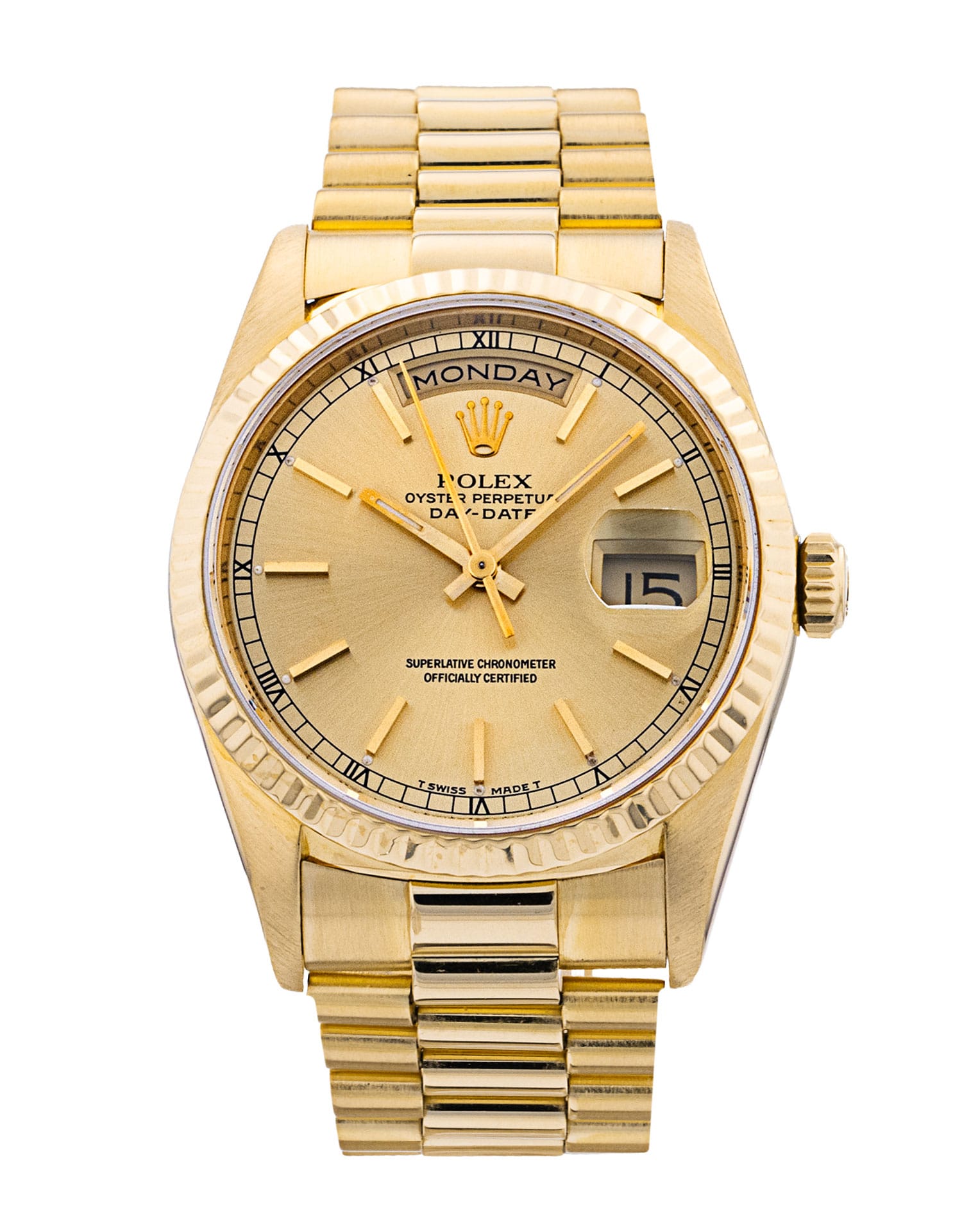 This Rolex Day-Date 18238 has a champagne baton with roman numerals dial and a bracelet strap. This Rolex has undergone a thorough inspection of water resistance, accuracy, functionality and condition to determine the level of reconditioning required to meet our strict standards. It has also been referenced against technical documents and manufacturer records where available to ensure authenticity and a clean history. All our watches have a 24-month warranty for your peace of mind. One of our skilled polishing technicians has removed marks on the case and bracelet of this watch, brought about by daily wear and tear, which is why this watch does not come with the remaining manufacturer’s warranty.