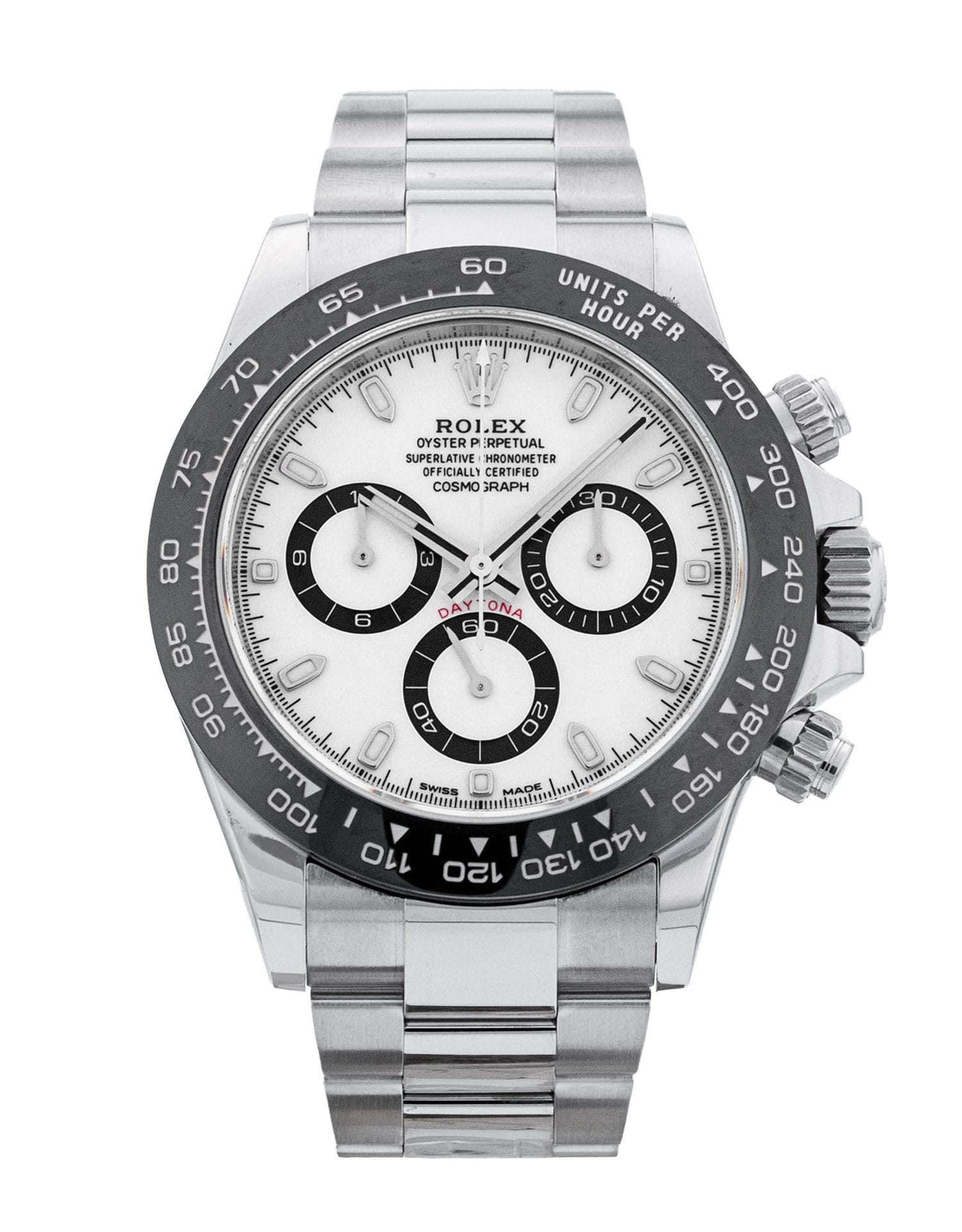 This Rolex Daytona 116500 LN has a white dial and a bracelet strap. This Rolex has undergone a thorough inspection of water resistance, accuracy, functionality and condition to determine the level of reconditioning required to meet our strict standards. It has also been referenced against technical documents and manufacturer records where available to ensure authenticity and a clean history. All our watches have a 24-month warranty for your peace of mind. One of our skilled polishing technicians has removed marks on the case and bracelet of this watch, brought about by daily wear and tear, which is why this watch does not come with the remaining manufacturer’s warranty.
