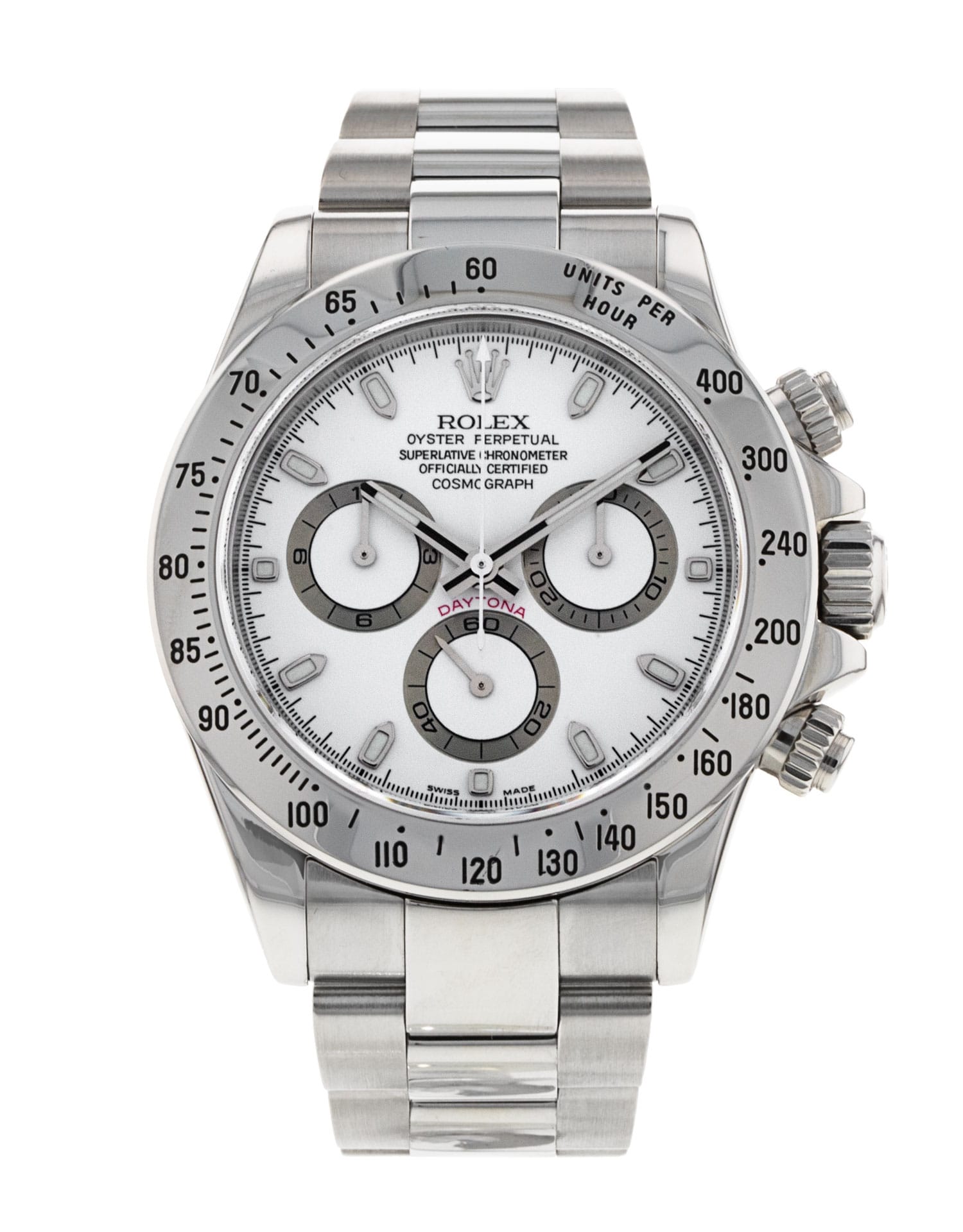 This Rolex Daytona 116520 has a white dial and a bracelet strap. This Rolex has undergone a thorough inspection of water resistance, accuracy, functionality and condition to determine the level of reconditioning required to meet our strict standards. It has also been referenced against technical documents and manufacturer records where available to ensure authenticity and a clean history. All our watches have a 24-month warranty for your peace of mind. One of our skilled polishing technicians has removed marks on the case and bracelet of this watch, brought about by daily wear and tear, which is why this watch does not come with the remaining manufacturer’s warranty.