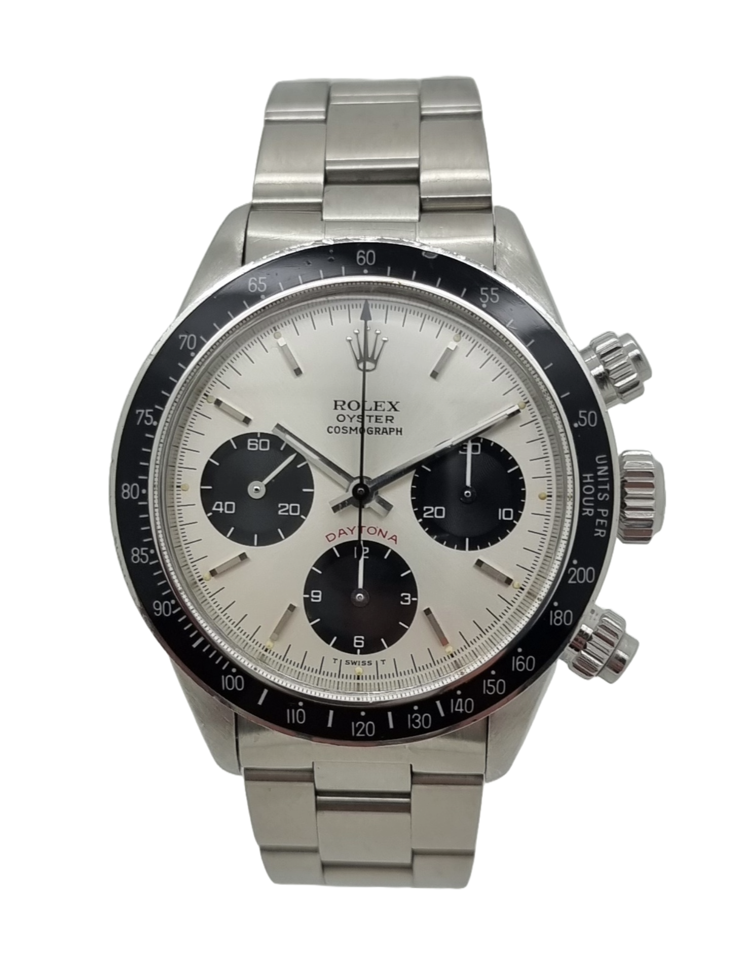 Diese spezifische Rolex Daytona 6263 hat ein silber baton ziffernblatt mit einem metall / keramik armband. Diese Rolex wurde einer gründlichen Prüfung der Wasserbeständigkeit, Genauigkeit, Funktionalität und des Zustands unterzogen, um den Grad der Überholung zu bestimmen, der zur Einhaltung unserer strengen Standards erforderlich ist. Sie wurde auch mit technischen Dokumenten und Herstelleraufzeichnungen verglichen, falls vorhanden, um Echtheit und einen einwandfreien Werdegang zu gewährleisten. Zu Ihrer Sicherheit verfügen alle unsere Uhren über eine 24-monatige Garantie. Einer unserer Poliertechniker hat die durch tägliche Abnutzung entstandenen Makel auf dem Gehäuse und dem Armband dieser Uhr entfernt, weshalb diese Uhr nicht mit der verbleibenden Herstellergarantie geliefert wird.